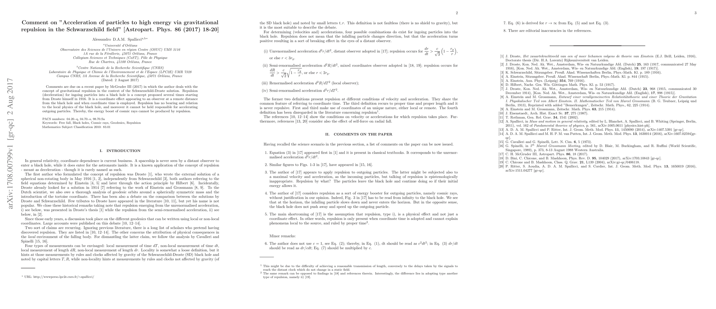 Comments are due on a recent paper by McGruder III (2017) in which the author deals with the concept of gravitational repulsion in the context of the Schwarzschild-Droste solution. Repulsion (deceleration) for ingoing particles into a black hole is a concept proposed several times starting from Droste himself in 1916. It is a coordinate effect appearing to an observer at a remote distance from the black hole and when coordinate time is employed. Repulsion has no bearing and relation to the local physics of the black hole, and moreover it cannot be held responsible for accelerating outgoing particles. Thereby, the energy boost of cosmic rays cannot be produced by repulsion.