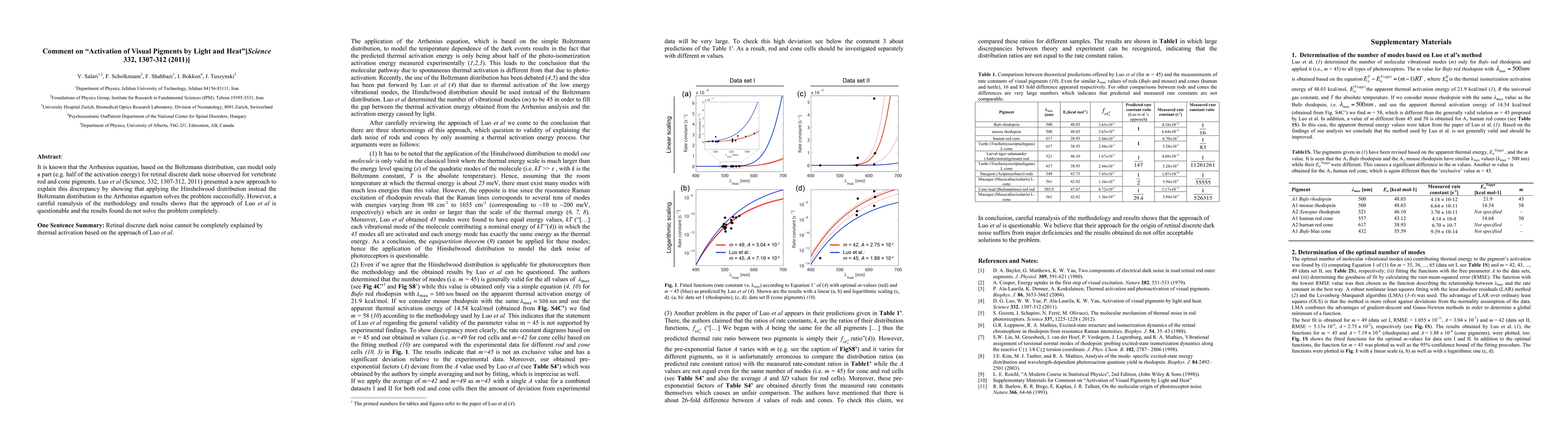It is known that the Arrhenius equation, based on the Boltzmann distribution, can model only a part (e.g. half of the activation energy) for retinal discrete dark noise observed for vertebrate rod and cone pigments. Luo et al (Science, 332, 1307-312, 2011) presented a new approach to explain this discrepancy by showing that applying the Hinshelwood distribution instead the Boltzmann distribution in the Arrhenius equation solves the problem successfully. However, a careful reanalysis of the methodology and results shows that the approach of Luo et al is questionable and the results found do not solve the problem completely.