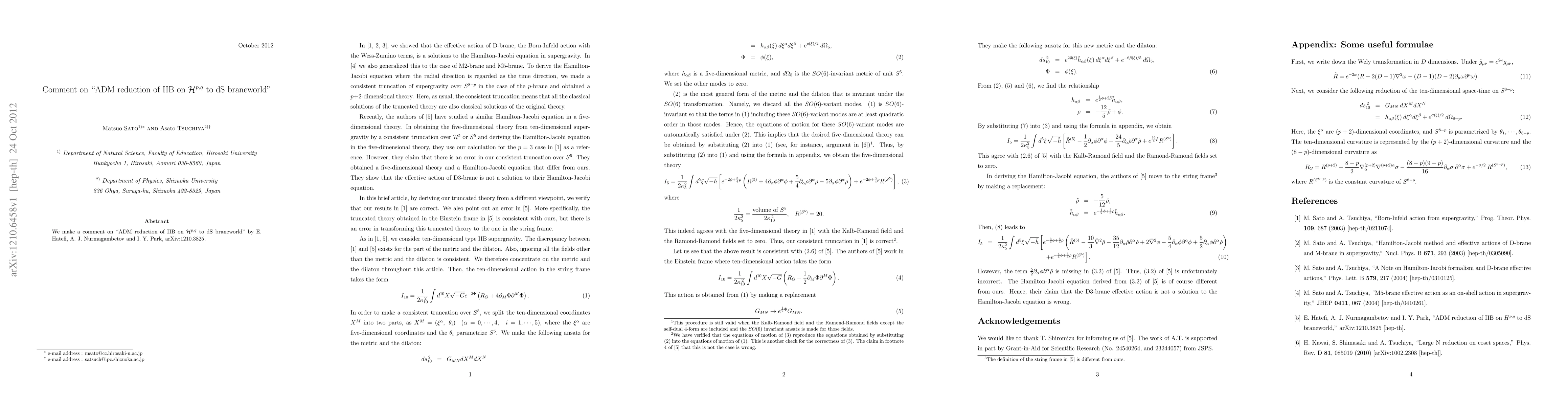 We make a comment on "ADM reduction of IIB on $H^{p,q}$ to dS braneworld" by E. Hatefi, A. J. Nurmagambetov and I. Y. Park, arXiv:1210.3825.