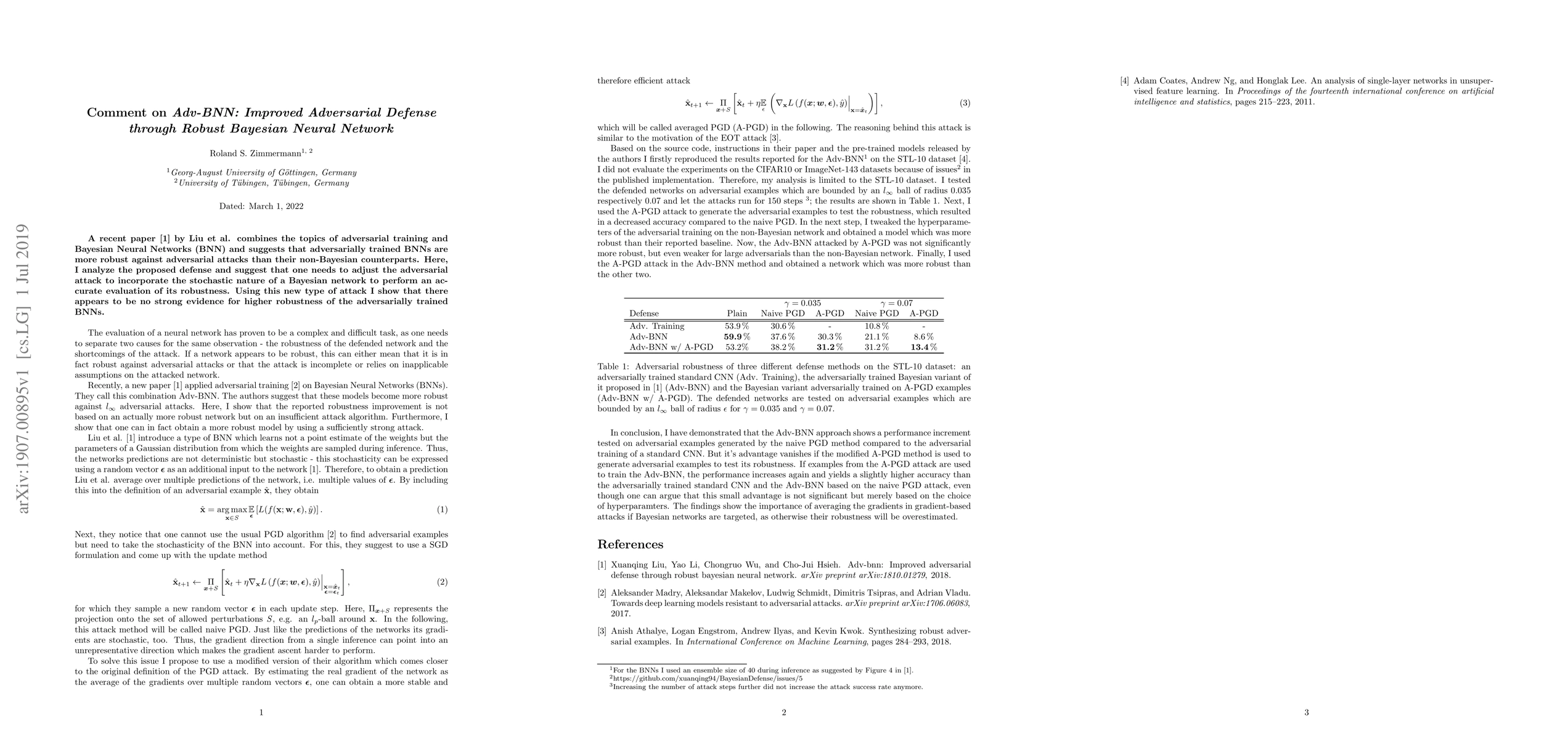 A recent paper by Liu et al. combines the topics of adversarial training and Bayesian Neural Networks (BNN) and suggests that adversarially trained BNNs are more robust against adversarial attacks than their non-Bayesian counterparts. Here, I analyze the proposed defense and suggest that one needs to adjust the adversarial attack to incorporate the stochastic nature of a Bayesian network to perform an accurate evaluation of its robustness. Using this new type of attack I show that there appears to be no strong evidence for higher robustness of the adversarially trained BNNs.