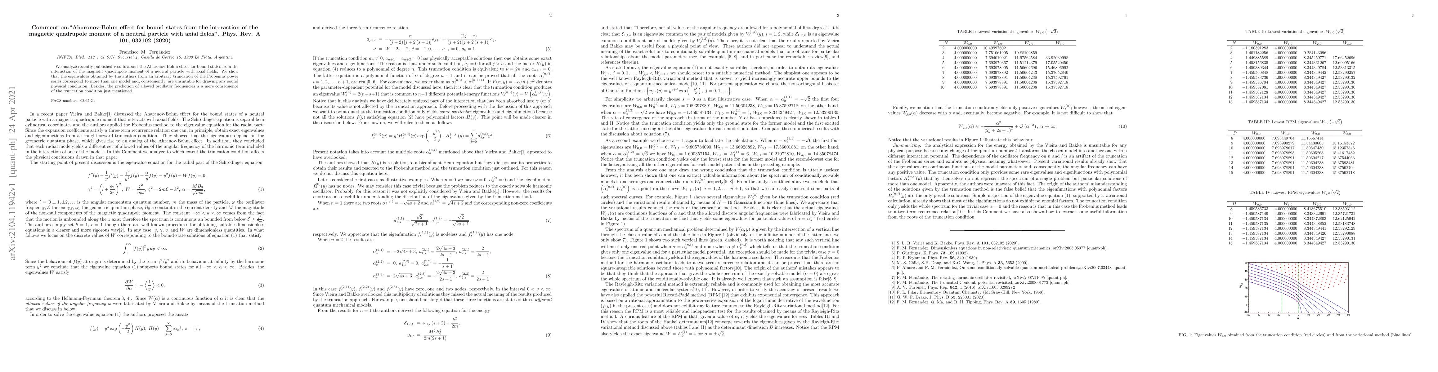 We analyze recently published results about the Aharonov-Bohm effect for bound states from the interaction of the magnetic quadrupole moment of a neutral particle with axial fields. We show that the eigenvalues obtained by the authors from an arbitrary truncation of the Frobenius power series correspond to more than one model and, consequently, are unsuitable for drawing any sound physical conclusion. Besides, the prediction of allowed oscillator frequencies is a mere consequence of the truncation condition just mentioned.