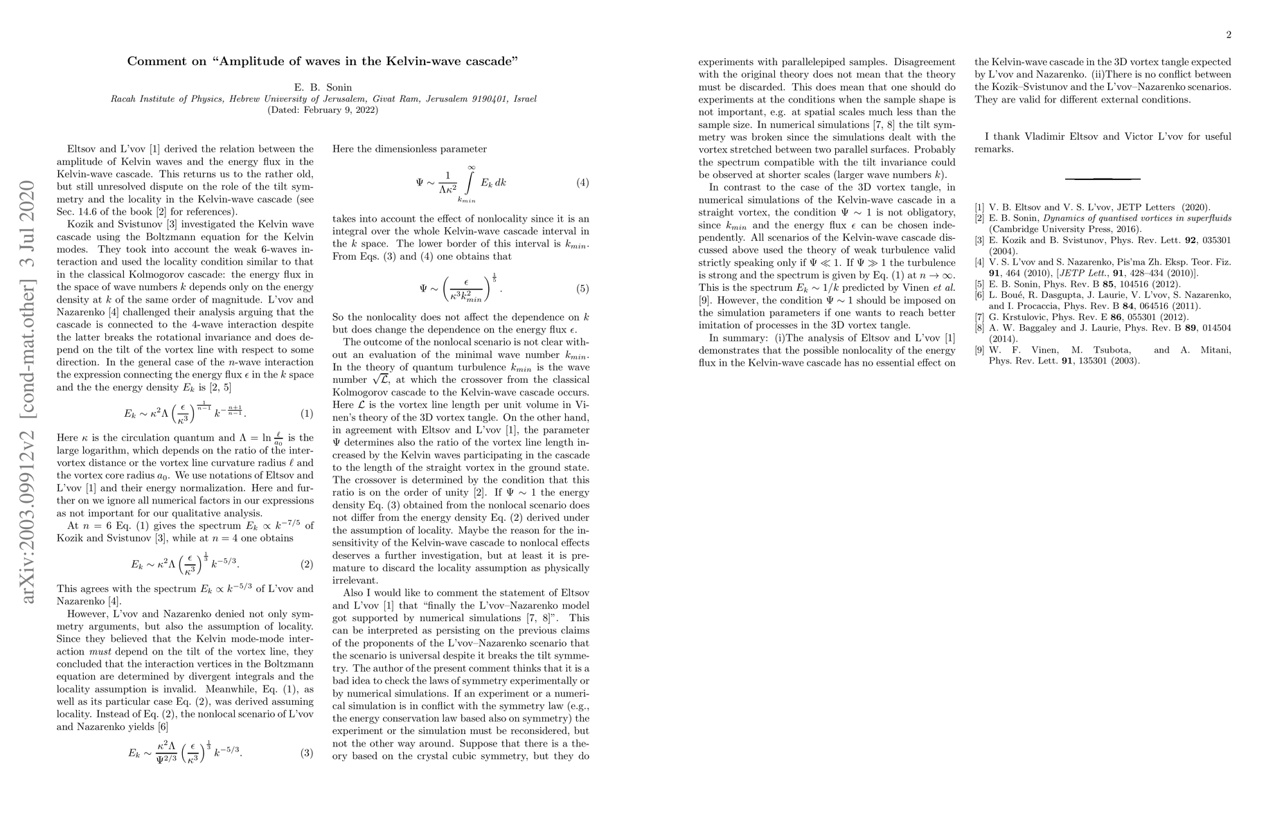 In the recently published preprint arXiv:200.02610 Eltsov and L'vov calculated the amplitudes of waves in the Kelvin-wave cascades. This returns us to the rather old, but still unresolved dispute on the role of the tilt symmetry and the locality in the Kelvin-wave cascade. The estimations by Eltsov and L'vov show that the possible nonlocality of the energy flux in the Kelvin-wave cascade has no essential effect on the Kelvin-wave cascade in the 3D vortex tangle.