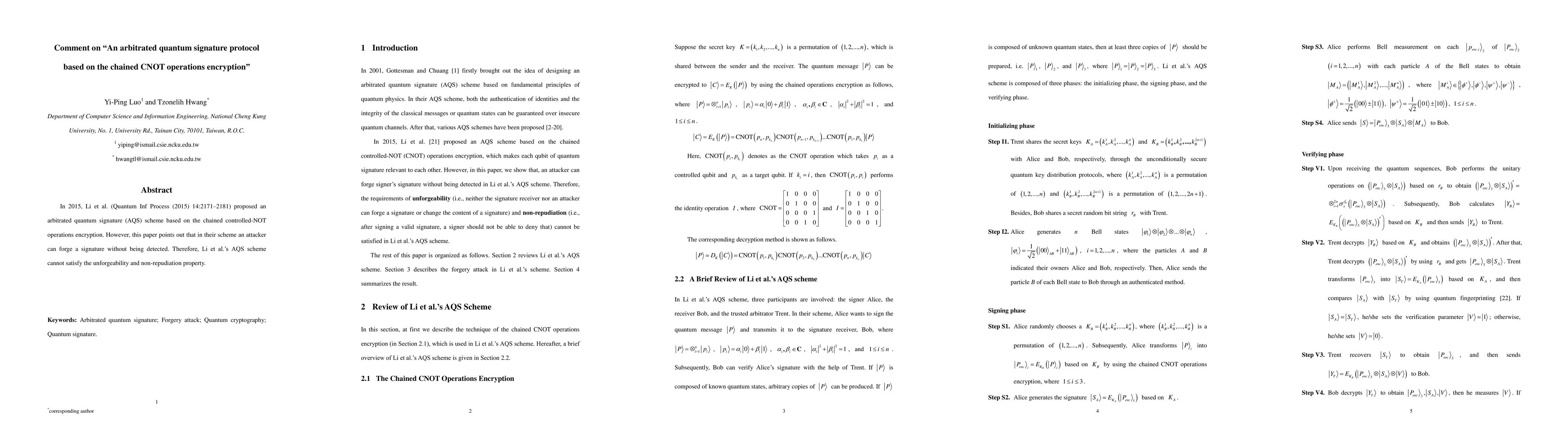 In 2015, Li et al. (Quantum Inf Process (2015) 14:2171-2181) proposed an arbitrated quantum signature (AQS) scheme based on the chained controlled-NOT operations encryption. However, this paper points out that in their scheme an attacker can forge a signature without being detected. Therefore, Li et al.'s AQS scheme cannot satisfy the unforgeability and non-repudiation property.