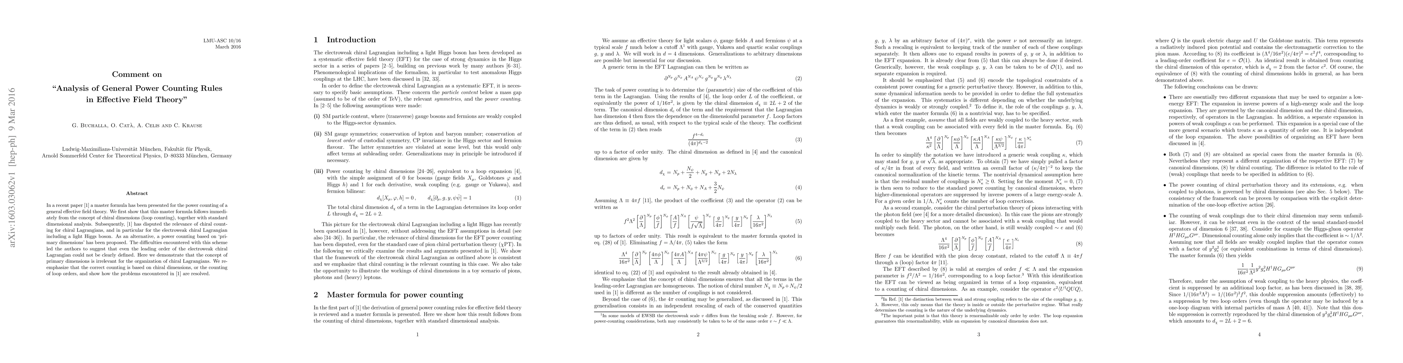 In a recent paper [1] a master formula has been presented for the power counting of a general effective field theory. We first show that this master formula follows immediately from the concept of chiral dimensions (loop counting), together with standard dimensional analysis. Subsequently, [1] has disputed the relevance of chiral counting for chiral Lagrangians, and in particular for the electroweak chiral Lagrangian including a light Higgs boson. As an alternative, a power counting based on `primary dimensions' has been proposed. The difficulties encountered with this scheme led the authors to suggest that even the leading order of the electroweak chiral Lagrangian could not be clearly defined. Here we demonstrate that the concept of primary dimensions is irrelevant for the organization of chiral Lagrangians. We re-emphasize that the correct counting is based on chiral dimensions, or the counting of loop orders, and show how the problems encountered in [1] are resolved.