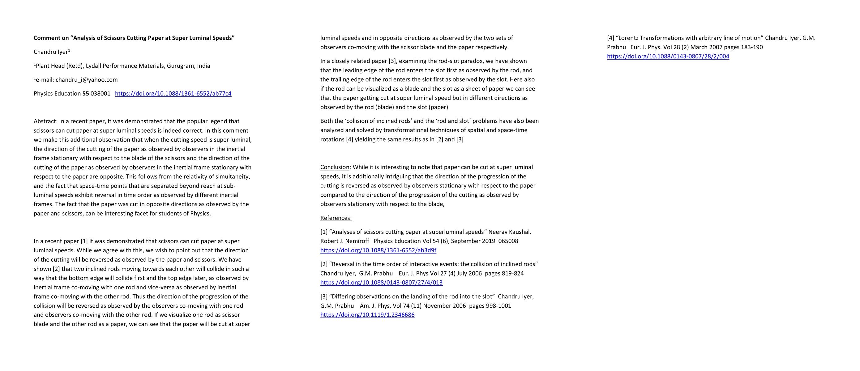 Research confirms that scissors can cut paper at super luminal speeds, with cutting directions observed by observers in different inertial frames being opposite due to relativity of simultaneity.