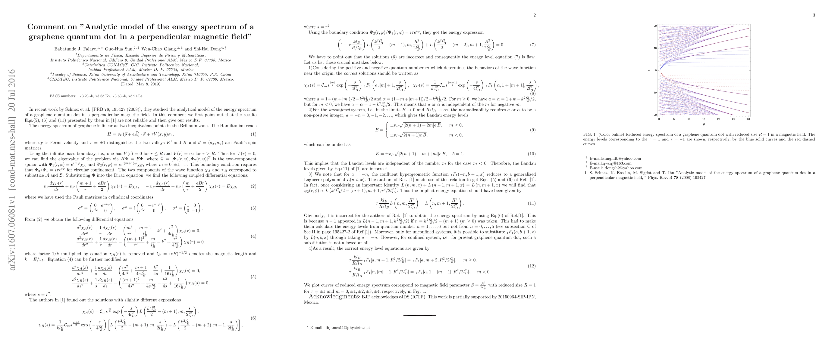 This comment critiques the analytical model of the energy spectrum of a graphene quantum dot in a perpendicular magnetic field by Schnez et al., highlighting that their results in Eqs.(5), (6), and (11) are unreliable, and presents alternative findings.
