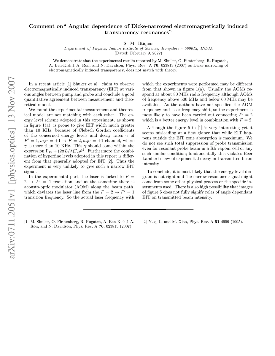 We demonstrate that the experimental results reported by M. Shuker, O. Firstenberg, R. Pugatch, A. Ben-Kish,1 A. Ron, and N. Davidson, Phys. Rev. A {\bf 76}, 023813 (2007) as Dicke narrowing of electromagnetically induced transparency, does not match with theory.