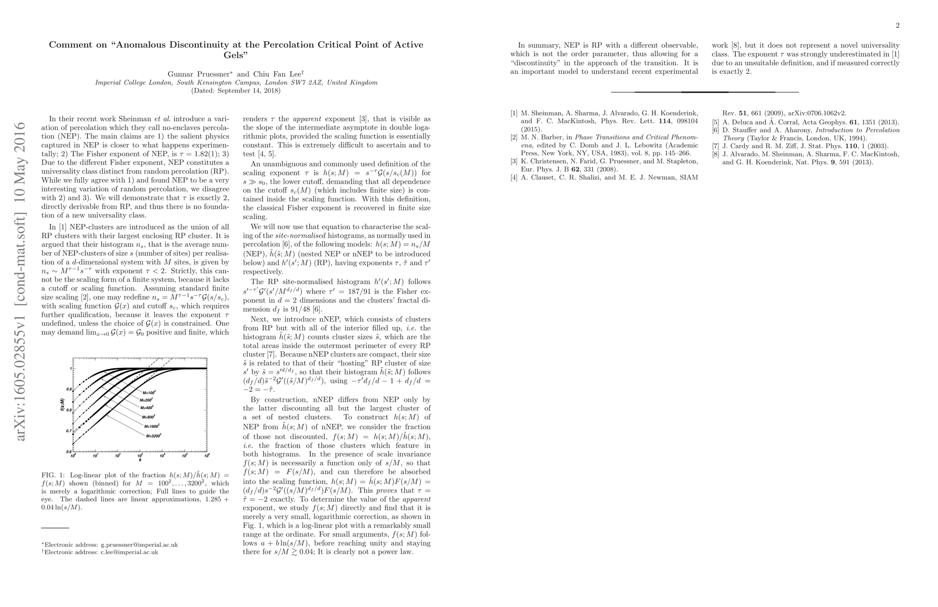 In their recent work Sheinman et al. [Phys. Rev. Lett. 114, 098104 (2015)] introduce a variation of percolation which they call no-enclaves percolation (NEP). The main claims are 1) the salient physics captured in NEP is closer to what happens experimentally; 2) The Fisher exponent of NEP, is $\tau=1.82(1)$; 3) Due to the different Fisher exponent, NEP constitutes a universality class distinct from random percolation (RP). While we fully agree with 1) and found NEP to be a very interesting variation of random percolation, we disagree with 2) and 3). We will demonstrate that $\tau$ is exactly $2$, directly derivable from RP, and thus there is no foundation of a new universality class.