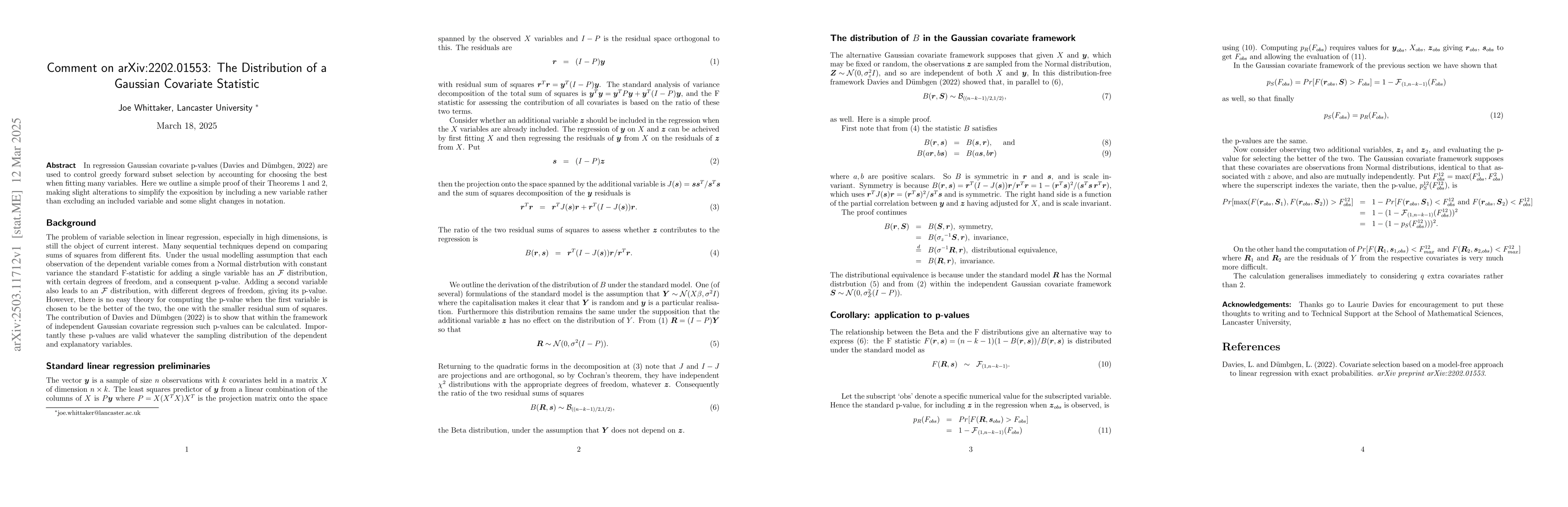 This is a comment on arXiv:2202.01553. In regression Gaussian covariate p-values (Davies and D{\"u}mbgen, arXiv:2202.01553) are used to control greedy forward subset selection by accounting for choosing the best when fitting many variables. Here we outline a simple proof of their Theorems 1 and 2, making alterations to simplify the exposition by including a new variable rather than excluding an included variable and some slight changes in notation.