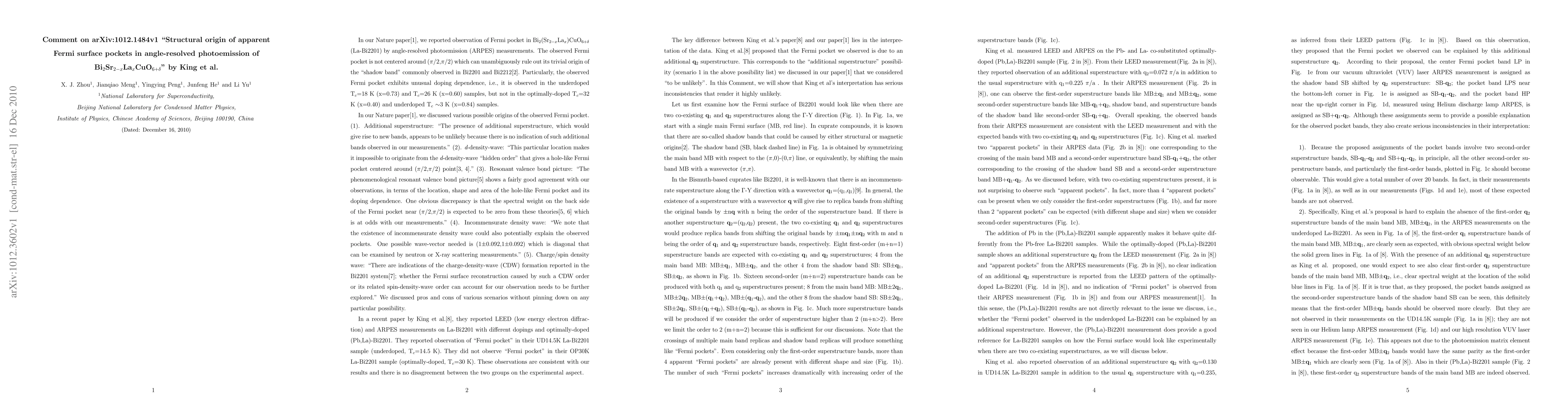In our Nature paper, we reported observation of Fermi pocket in Bi_2(Sr_{2-x}La_x)CuO_{6+\delta} (La-Bi2201) by angle-resolved photoemission (ARPES) measurements. King et al. tried to assign the Fermi pocket we observed as due to an additional q2 superstructure. In the process, it creates a number of serious inconsistencies and flaws in their interpretation. Any one of these inconsistencies goes strongly against King et al.'s proposal, making their proposed structural origin highly unlikely as the cause of the observed Fermi pocket. In our Nature paper, we already pointed out that this structural origin is unlikely based on the absence of additional q2-induced first-order superstructure bands of the main band MB. This conclusion remains valid and gains even stronger support by considering King et al's data.
