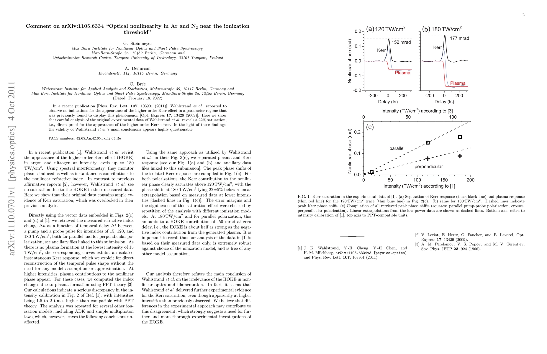 In a recent publication [Phys. Rev. Lett. 107, 103901 (2011)], Wahlstrand et al. reported to observe no indications for the appearance of the higher-order Kerr effect in a parameter regime that was previously found to display this phenomenon [Opt. Express 17, 13429 (2009)]. Here we show that careful analysis of the original experimental data of Wahlstrand et al. reveals a 22% saturation, i.e., direct proof for the appearance of the higher-order Kerr effect. In the light of these findings, the validity of Wahlstrand et al.'s main conclusions appears highly questionable.