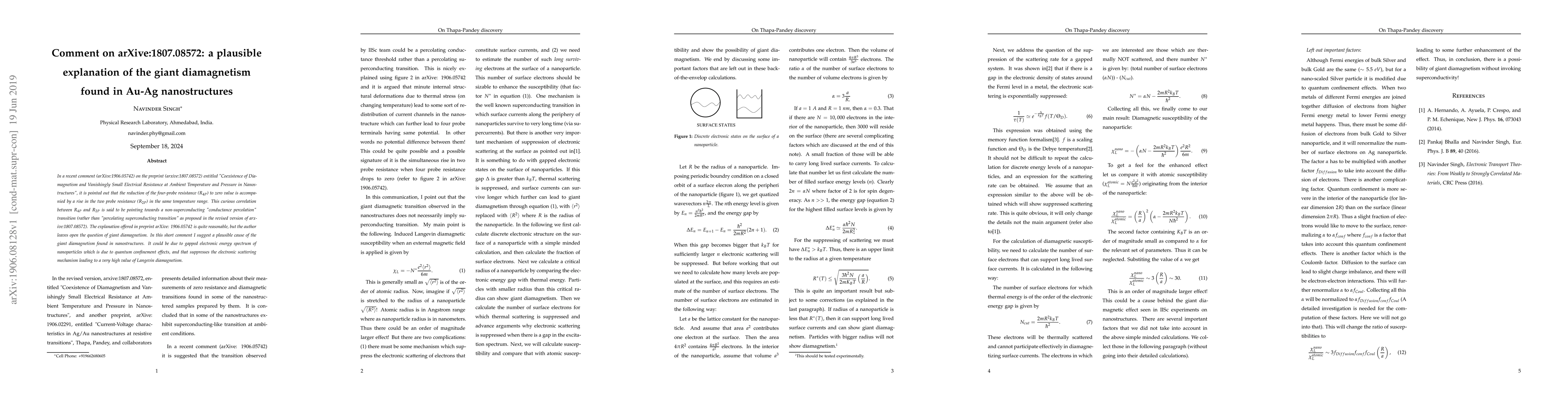 In a recent comment (arXiv:1906.05742) on the preprint (arXiv:1807.08572) entitled "Coexistence of Diamagnetism and Vanishingly Small Electrical Resistance at Ambient Temperature and Pressure in Nanostructures", it is pointed out that the reduction of the four-probe resistance ($R_{4P}$) to zero value is accompanied by a rise in the two probe resistance ($R_{2P}$) in the same temperature range. This curious correlation between $R_{4P}$ and $R_{2P}$ is said to be pointing towards a non-superconducting "conductance percolation" transition (rather than "percolating superconducting transition" as proposed in the revised version of arxiv:1807.08572). The explanation offered in preprint arXiv:1906.05742 is quite reasonable, but the author leaves open the question of giant diamagnetism. In this short comment I suggest a plausible cause of the giant diamagnetism found in nanostructures. It could be due to gapped electronic energy spectrum of nanoparticles which is due to quantum confinement effects, and that suppresses the electronic scattering mechanism leading to a very high value of Langevin diamagnetism.