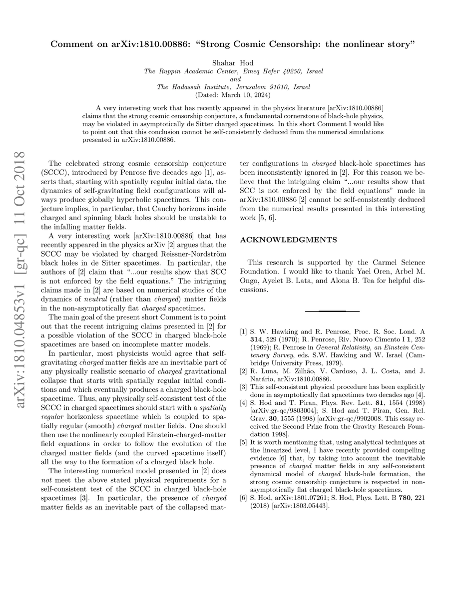 A very interesting work that has recently appeared in the physics literature [arXiv:1810.00886] claims that the strong cosmic censorship conjecture, a fundamental cornerstone of black-hole physics, may be violated in asymptotically de Sitter charged spacetimes. In this short Comment I would like to point out that this conclusion cannot be self-consistently deduced from the numerical simulations presented in arXiv:1810.00886.