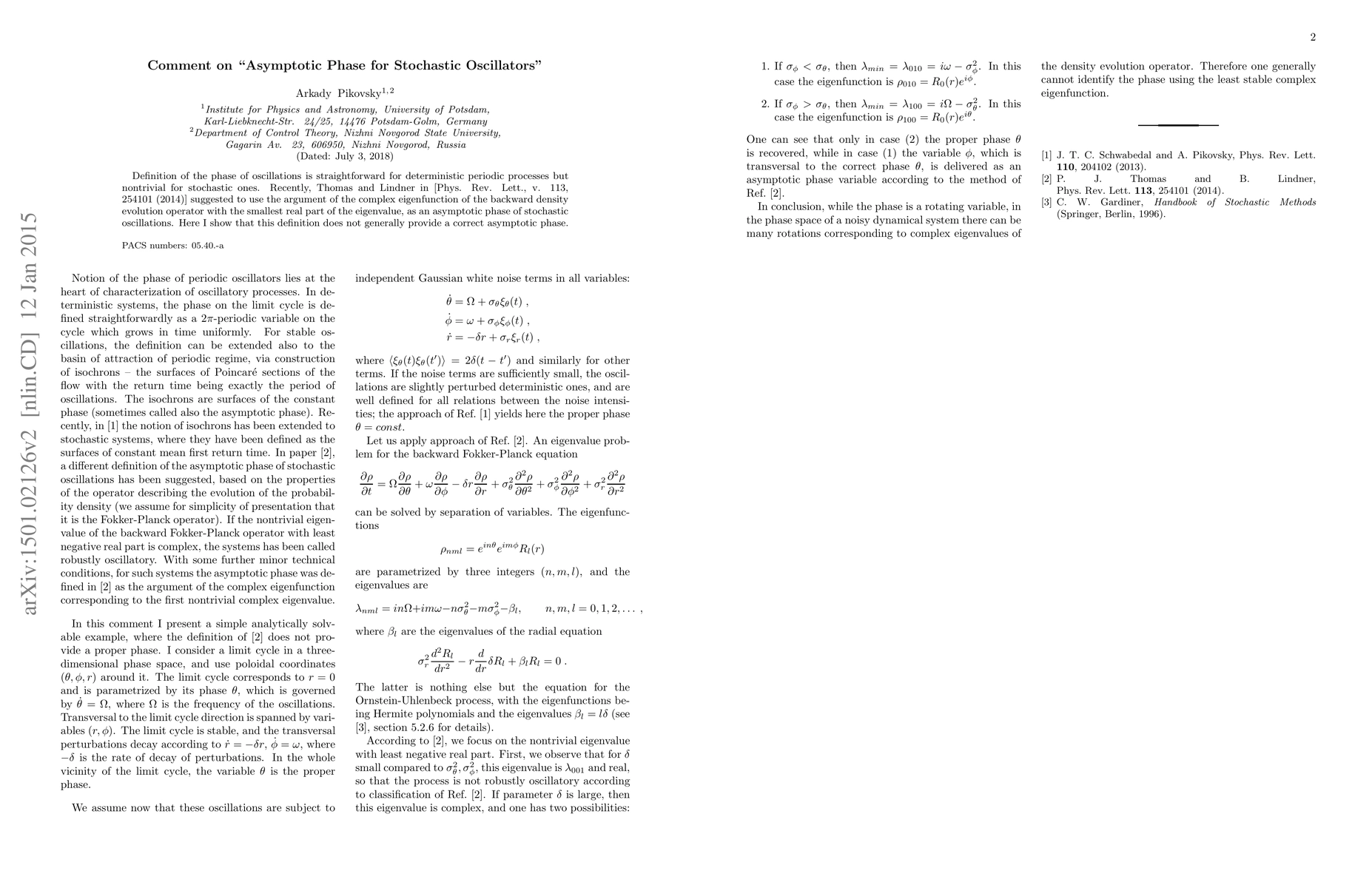 Definition of the phase of oscillations is straightforward for deterministic periodic processes but nontrivial for stochastic ones. Recently, Thomas and Lindner in [Phys. Rev. Lett., v. 113, 254101 (2014)] suggested to use the argument of the complex eigenfunction of the backward density evolution operator with the smallest real part of the eigenvalue, as an asymptotic phase of stochastic oscillations. Here I show that this definition does not generally provide a correct asymptotic phase.