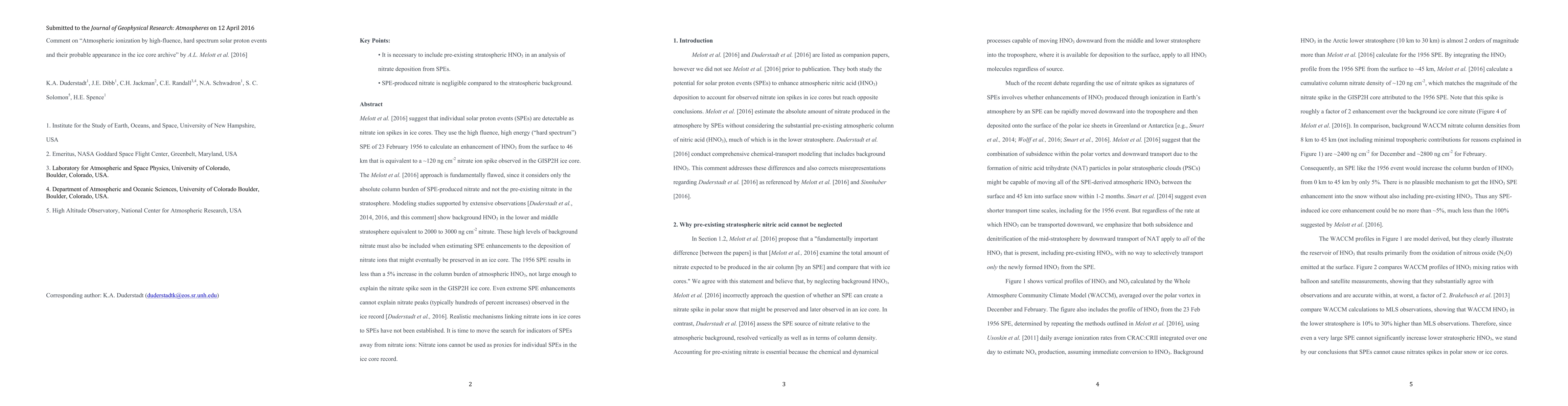 Melott et al. [2016] suggest that individual solar proton events (SPEs) are detectable as nitrate ion spikes in ice cores. They use the high fluence, high energy (hard spectrum) SPE of 23 February 1956 to calculate an enhancement of HNO3 from the surface to 46 km that is equivalent to a ~120 ng cm-2 nitrate ion spike observed in the GISP2H ice core. The Melott et al. [2016] approach is fundamentally flawed, since it considers only the absolute column burden of SPE-produced nitrate and not the pre-existing nitrate in the stratosphere. Modeling studies supported by extensive observations [Duderstadt et al., 2014, 2016, and this comment] show background HNO3 in the lower and middle stratosphere equivalent to 2000 to 3000 ng cm-2 nitrate. These high levels of background nitrate must also be included when estimating SPE enhancements to the deposition of nitrate ions that might eventually be preserved in an ice core. The 1956 SPE results in less than a 5% increase in the column burden of atmospheric HNO3, not large enough to explain the nitrate spike seen in the GISP2H ice core. Even extreme SPE enhancements cannot explain nitrate peaks (typically hundreds of percent increases) observed in the ice record [Duderstadt et al., 2016]. Realistic mechanisms linking nitrate ions in ice cores to SPEs have not been established. It is time to move the search for indicators of SPEs away from nitrate ions: Nitrate ions cannot be used as proxies for individual SPEs in the ice core record.
