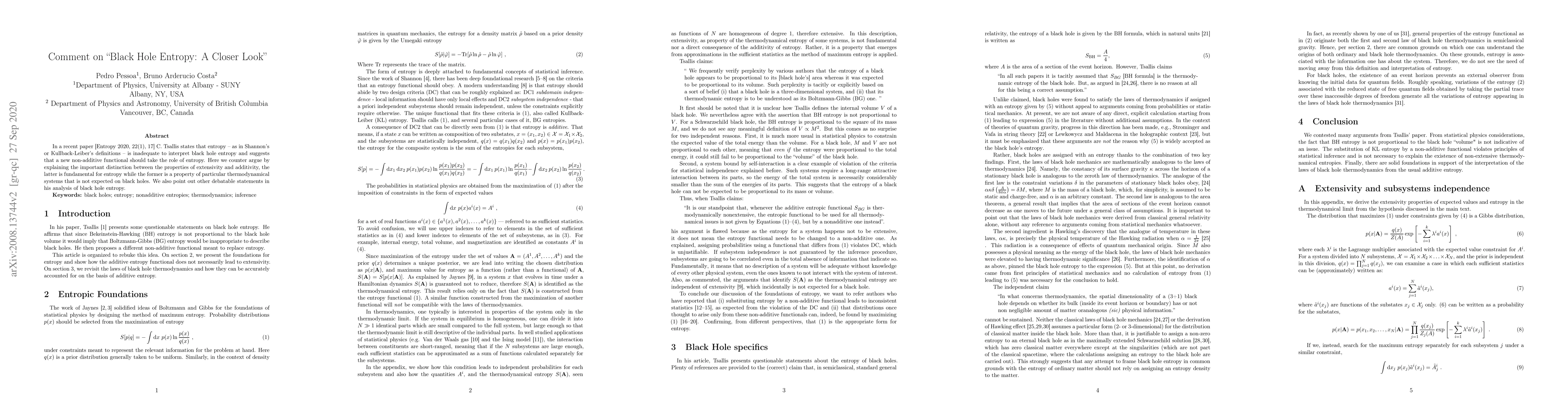 In a recent paper [Entropy 2020, 22(1), 17] C. Tsallis states that entropy -- as in Shannon's or Kullback-Leiber's definitions -- is inadequate to interpret black hole entropy and suggests that a new non-additive functional should take the role of entropy. Here we counter argue by explaining the important distinction between the properties of extensivity and additivity, the latter is fundamental for entropy while the former is a property of particular thermodynamical systems that is not expected on black holes. We also point out other debatable statements in his analysis of black hole entropy.