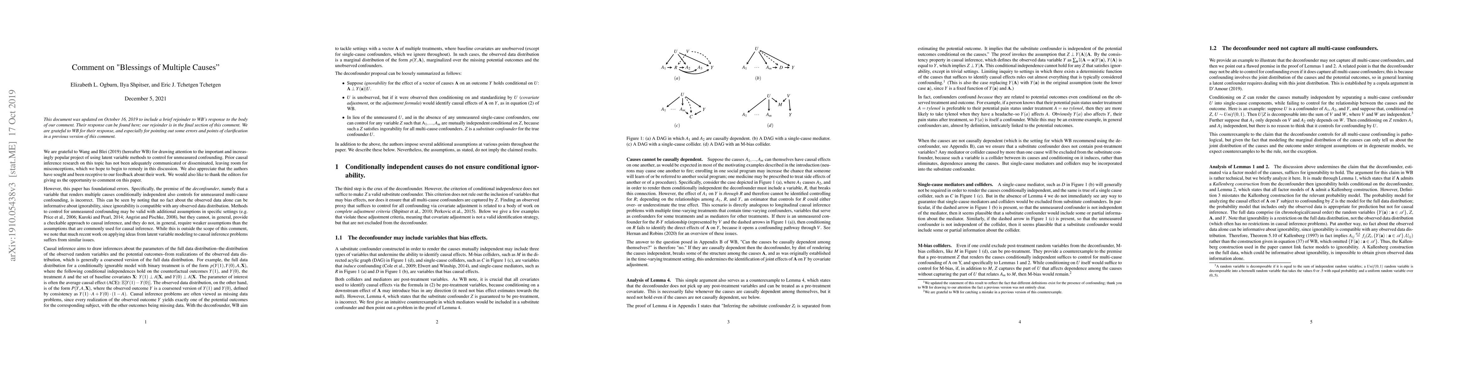(This comment has been updated to respond to Wang and Blei's rejoinder [arXiv:1910.07320].) The premise of the deconfounder method proposed in "Blessings of Multiple Causes" by Wang and Blei [arXiv:1805.06826], namely that a variable that renders multiple causes conditionally independent also controls for unmeasured multi-cause confounding, is incorrect. This can be seen by noting that no fact about the observed data alone can be informative about ignorability, since ignorability is compatible with any observed data distribution. Methods to control for unmeasured confounding may be valid with additional assumptions in specific settings, but they cannot, in general, provide a checkable approach to causal inference, and they do not, in general, require weaker assumptions than the assumptions that are commonly used for causal inference. While this is outside the scope of this comment, we note that much recent work on applying ideas from latent variable modeling to causal inference problems suffers from similar issues.