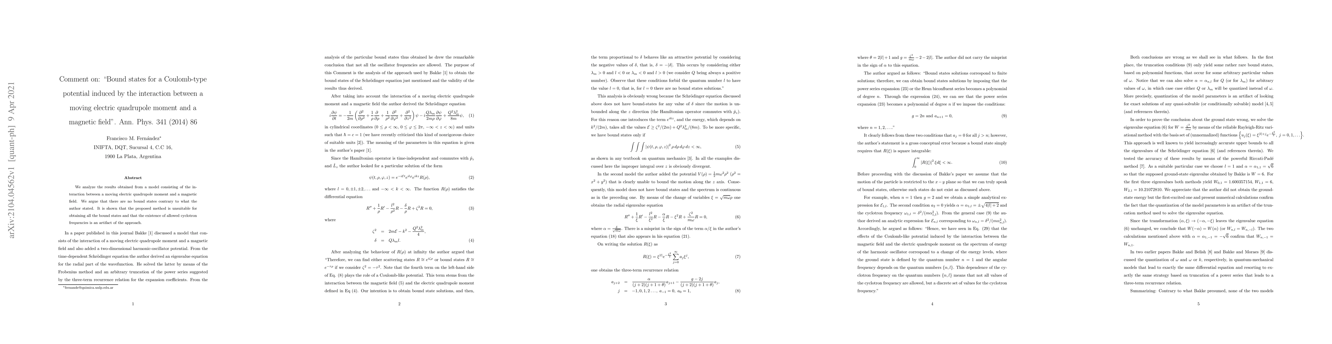 We analyze the results obtained from a model consisting of the interaction between a moving electric quadrupole moment and a magnetic field. We argue that there are no bound states contrary to what the author stated. It is shown that the proposed method is unsuitable for obtaining all the bound states and that the existence of allowed cyclotron frequencies is an artifact of the approach.