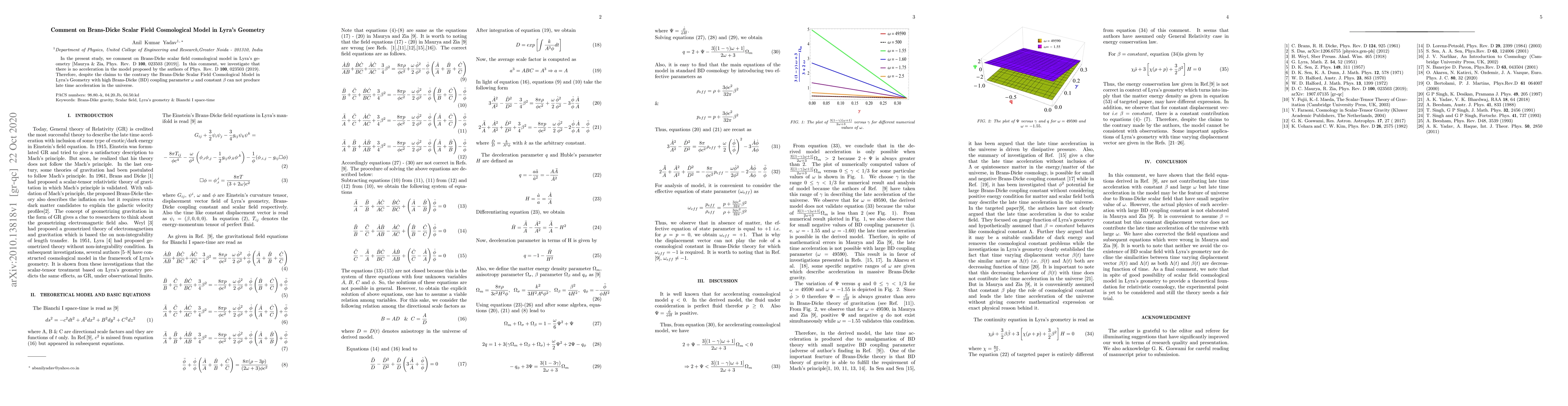 In the present study, we comment on Brans-Dicke scalar field cosmological model in Lyra's geometry [Maurya \& Zia, Phys. Rev. D \textbf{100}, 023503 (2019)]. In this comment, we investigate that there is no acceleration in the model proposed by the authors of Phys. Rev. D \textbf{100}, 023503 (2019). Therefore, despite the claims to the contrary the Brans-Dicke Scalar Field Cosmological Model in Lyra's Geometry with high Brans-Dicke (BD) coupling parameter $\omega$ and constant $\beta$ can not produce late time acceleration in the universe.