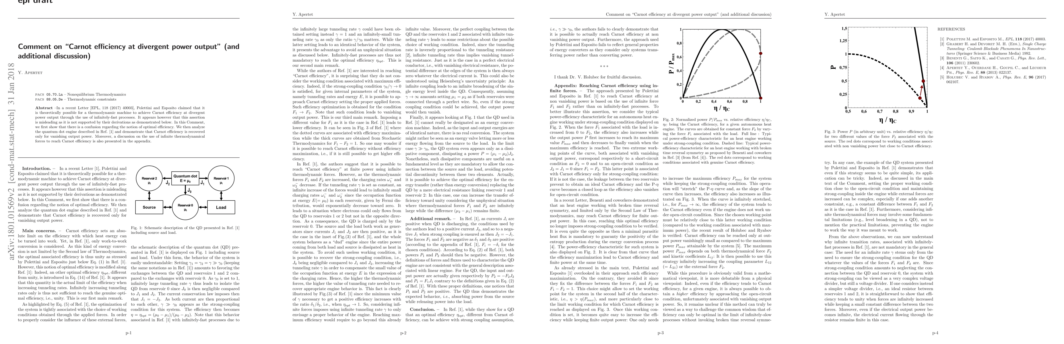 This Comment critiques Polettini and Esposito's claim of achieving Carnot efficiency at divergent power output, showing that their assertion is misleading due to confusion regarding optimal efficiency. It demonstrates that Carnot efficiency is only recovered for zero output power in the analyzed quantum dot engine.