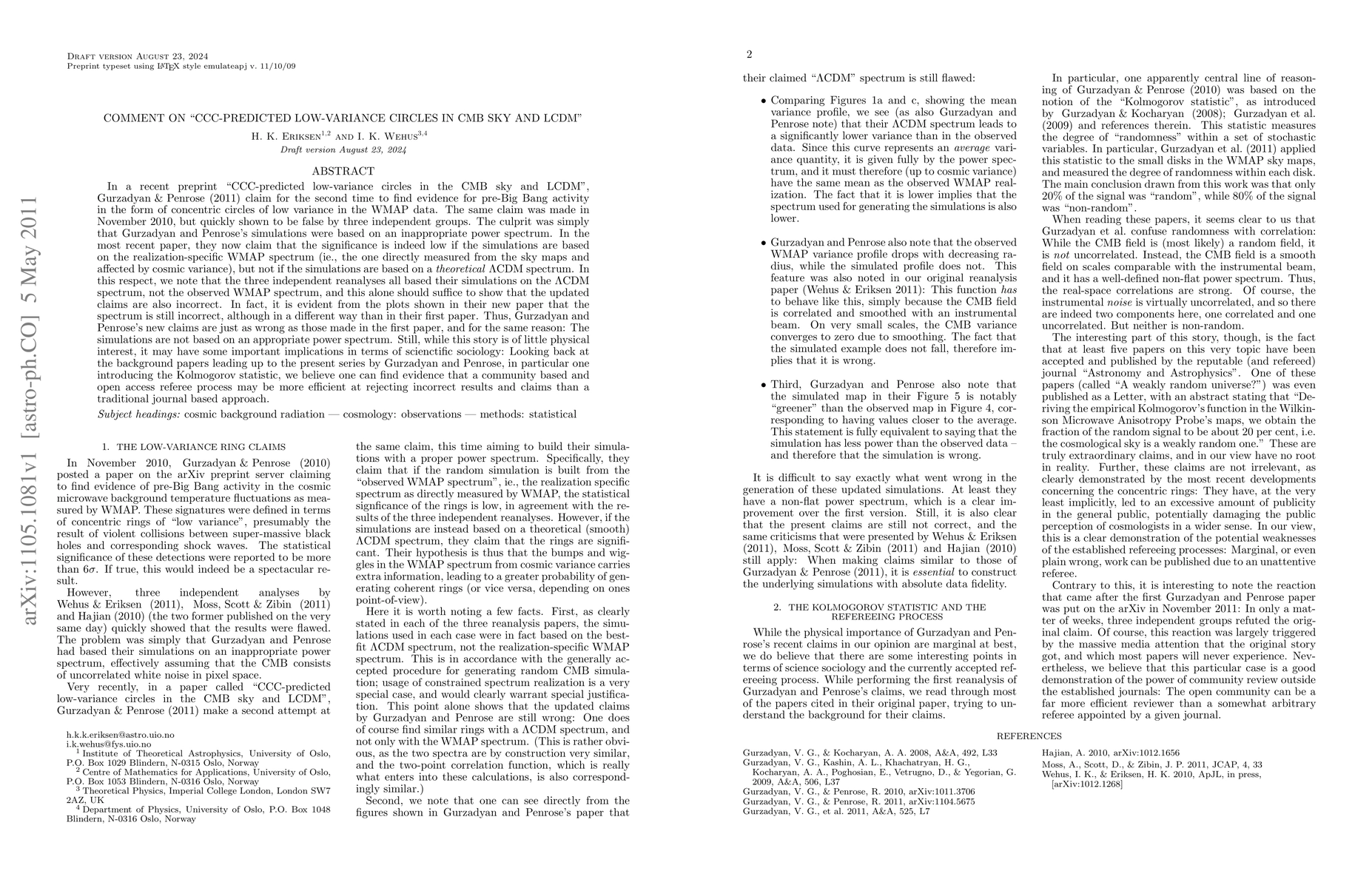 In a recent preprint ("CCC-predicted low-variance circles in the CMB sky and LCDM"), Gurzadyan and Penrose (2011) claim for the second time to find evidence for pre-Big Bang activity in the form of concentric circles of low variance in the WMAP data. The same claim was made in November 2010, but quickly shown to be false by three independent groups. The culprit was simply that Gurzadyan and Penrose's simulations were based on an inappropriate power spectrum. In the most recent paper, they now claim that the significance is indeed low if the simulations are based on the realization-specific WMAP spectrum (ie., the one directly measured from the sky maps and affected by cosmic variance), but not if the simulations are based on a theoretical LCDM spectrum. In this respect, we note that the three independent reanalyses all based their simulations on the LCDM spectrum, not the observed WMAP spectrum, and this alone should suffice to show that the updated claims are also incorrect. In fact, it is evident from the plots shown in their new paper that the spectrum is still incorrect, although in a different way than in their first paper. Thus, Gurzadyan and Penrose's new claims are just as wrong as those made in the first paper, and for the same reason: The simulations are not based on an appropriate power spectrum. Still, while this story is of little physical interest, it may have some important implications in terms of scienctific sociology: Looking back at the background papers leading up to the present series by Gurzadyan and Penrose, in particular one introducing the Kolmogorov statistic, we believe one can find evidence that a community based and open access referee process may be more efficient at rejecting incorrect results and claims than a traditional journal based approach.