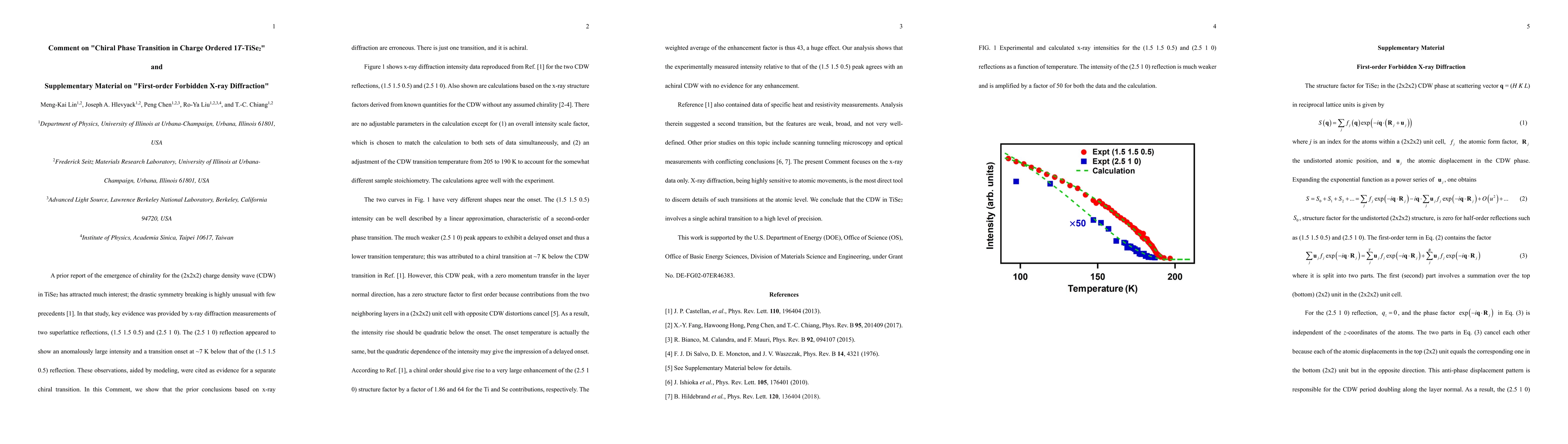 A prior report of the emergence of chirality for the (2x2x2) charge density wave (CDW) in TiSe2 has attracted much interest; the drastic symmetry breaking is highly unusual with few precedents [1]. In that study, key evidence was provided by x-ray diffraction measurements of two superlattice reflections, (1.5 1.5 0.5) and (2.5 1 0). The (2.5 1 0) reflection appeared to show an anomalously large intensity and a transition onset at ~7 K below that of the (1.5 1.5 0.5) reflection. These observations, aided by modeling, were cited as evidence for a separate chiral transition. In this Comment, we show that the prior conclusions based on x-ray diffraction are erroneous. There is just one transition, and it is achiral.