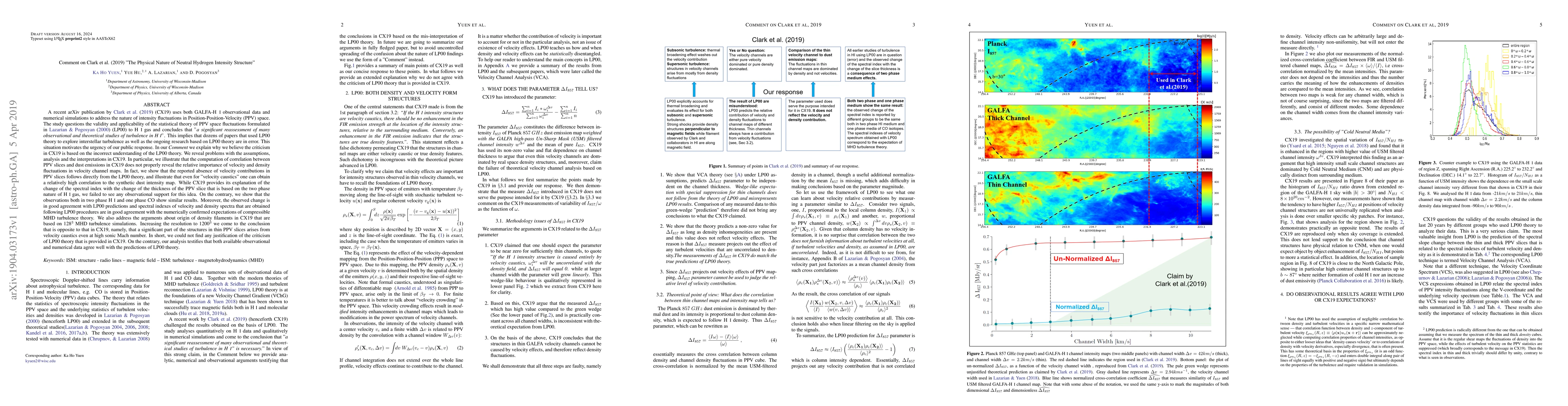 A recent publication by Clark et.al (2019, CX19) uses both GALFA-HI observational data and numerical simulations to address the nature of intensity fluctuations in Position-Position-Velocity (PPV) space. The study questions the validity and applicability of the statistical theory of PPV space fluctuations formulated in Lazarian & Pogosyan (2000, LP00) to HI gas and concludes that $"${\it a significant reassessment of many observational and theoretical studies of turbulence in HI}$"$. This implies that dozens of papers that used LP00 theory to explore interstellar turbulence as well as the ongoing research based on LP00 theory are in error. This situation motivates the urgency of our public response. In our Comment we explain why we believe the criticism in CX19 is based on the incorrect understanding of the LP00 theory. In particular, we illustrate that the correlation between PPV slices and dust emissions in CX19 does not properly reveal the relative importance of velocity and density fluctuations in velocity channel maps. While CX19 provides an explanation of the change of the spectral index with respect to the thickness of PPV slice based on the two-phase nature of H1 gas, we failed to see any observational support for this idea. On the contrary, we show that the observations both in two-phase HI and one phase CO show similar results. Moreover, the observed change is in good agreement with LP00 predictions and spectral indexes of velocity and density spectra that are obtained following LP00 procedures are in good agreement with the numerically confirmed expectations of compressible MHD turbulence theory. In short, we could not find any justification of the criticism of LP00 theory that is provided in CX19. On the contrary, our analysis testifies that both available observational and numerical data agree well with the predictions of LP00 theory.