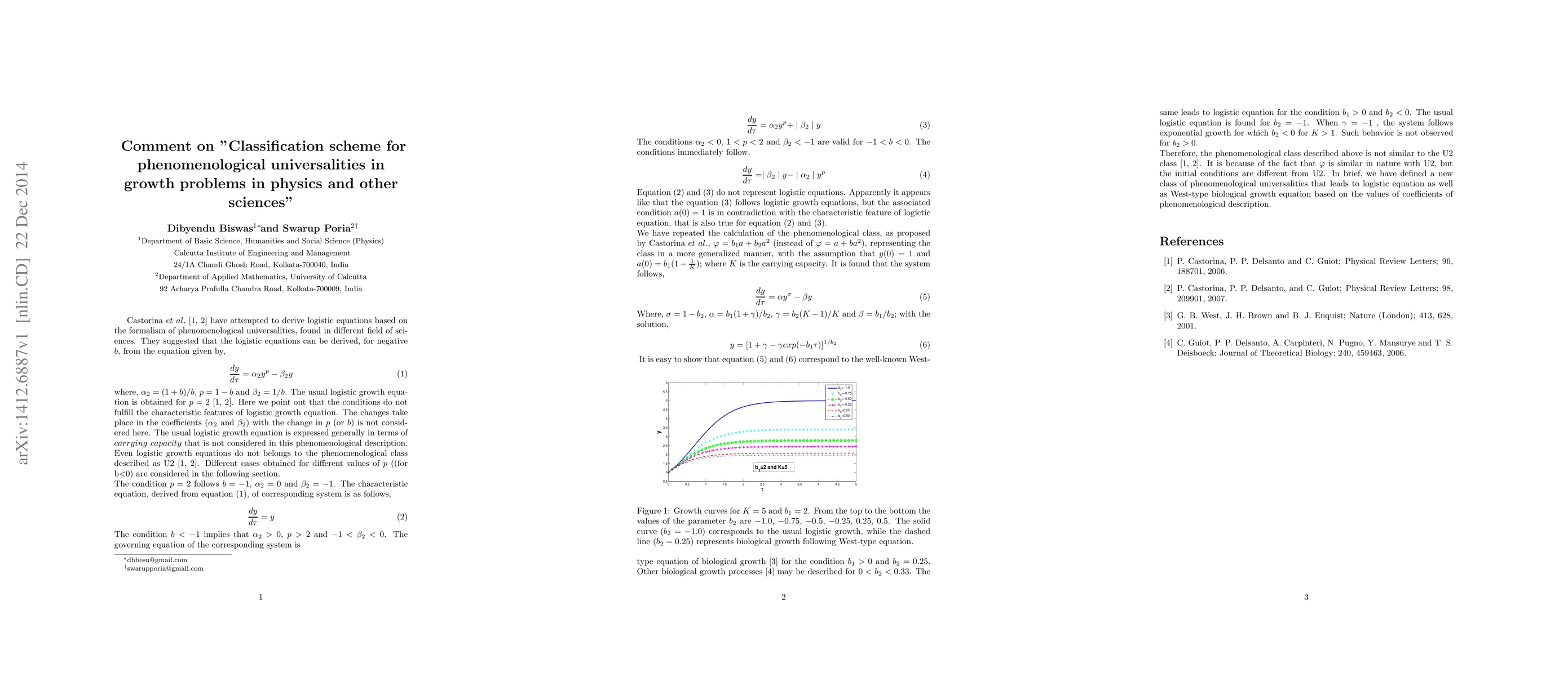 In this communication, the incorrectness of phenomenological approach to the logistic growth equation, proposed by Castorina et al. is presented in detail. The correct phenomenological approach to logistic growth equation is also proposed here. It is also shown that the same leads to different types of biological growths also.