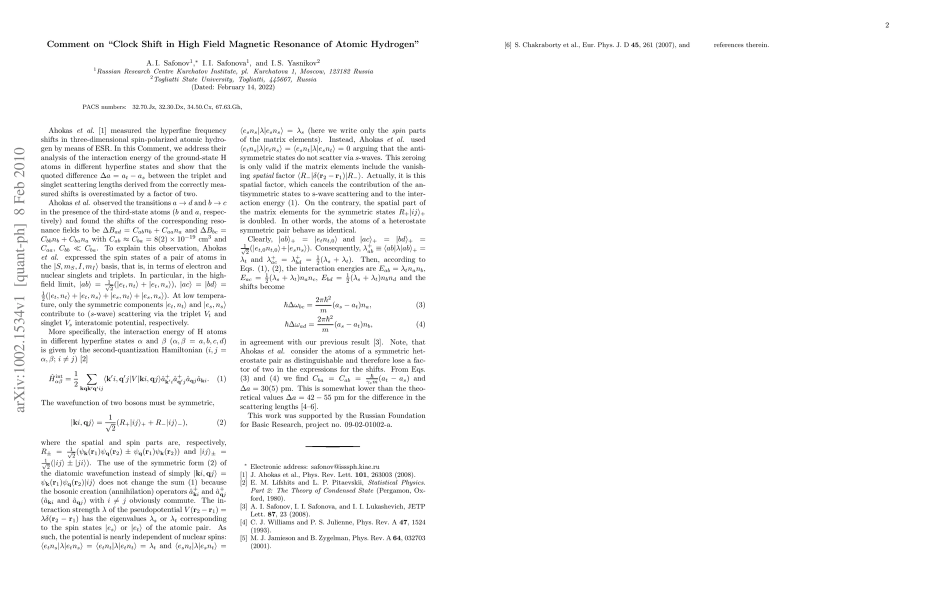 This Comment reanalyzes experiments on the collision frequency shift in high field magnetic resonance of atomic hydrogen, correcting a factor-of-two error in previous work. It accurately determines the difference between triplet and singlet s-wave scattering lengths, yielding a_T-a_S=0.30(5) Å.