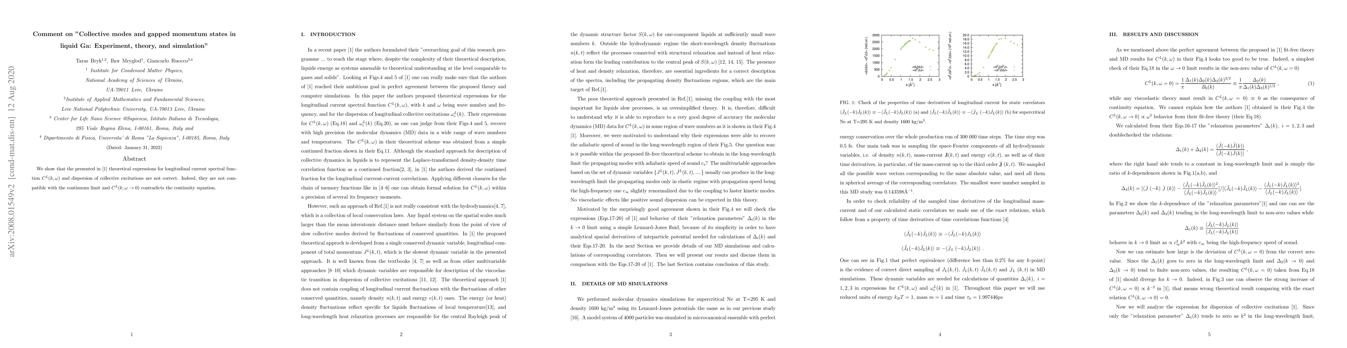 We show that the presented in Phys.Rev.B, v.101, 214312 (2020) theoretical expressions for longitudinal current spectral function $C^L(k,\omega)$ and dispersion of collective excitations are not correct. Indeed, they are not compatible with the continuum limit and $C^L(k,\omega\to 0)$ contradicts the continuity equation.