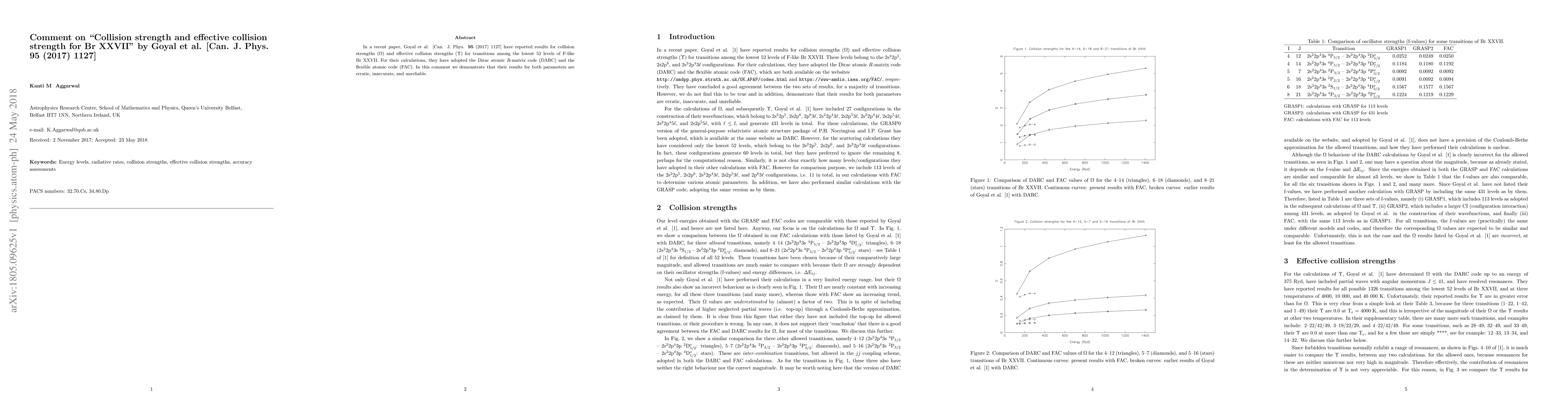 In a recent paper, Goyal et al. [Can. J. Phys. {\bf 95} (2017) 1127] have reported results for collision strengths ($\Omega$) and effective collision strengths ($\Upsilon$) for transitions among the lowest 52 levels of F-like Br~XXVII. For their calculations, they have adopted the Dirac atomic $R$-matrix code (DARC) and the flexible atomic code (FAC). In this comment we demonstrate that their results for both parameters are erratic, inaccurate, and unreliable.