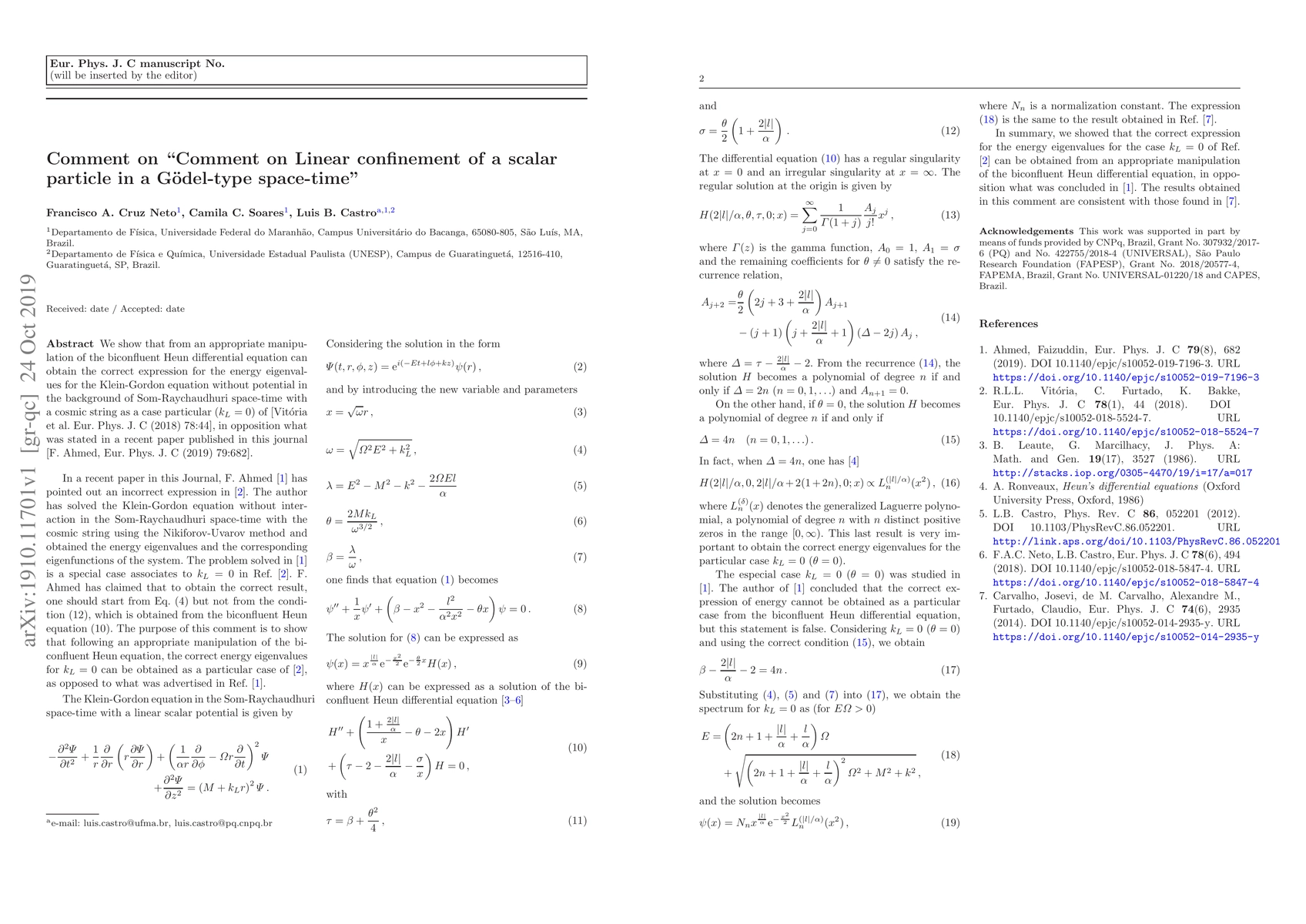 We show that from an appropriate manipulation of the biconfluent Heun differential equation can obtain the correct expression for the energy eigenvalues for the Klein-Gordon equation without potential in the background of Som-Raychaudhuri space-time with a cosmic string as a case particular ($k_{L}=0$) of [Vit\'{o}ria et al. Eur. Phys. J. C (2018) 78:44], in opposition what was stated in a recent paper published in this journal [F. Ahmed, Eur. Phys. J. C (2019) 79:682].