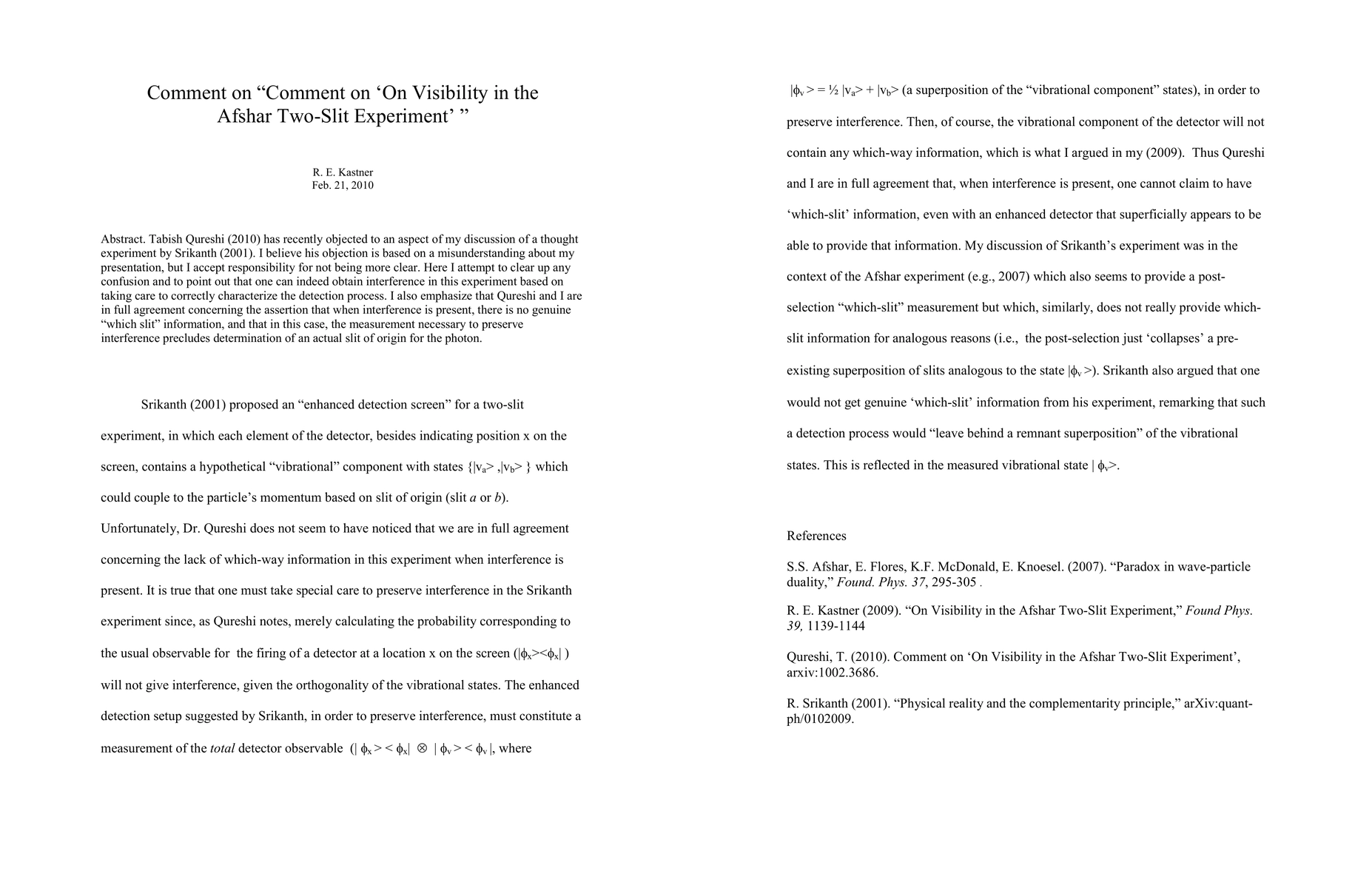 Tabish Qureshi (2010) has recently objected to an aspect of my discussion of a thought experiment by Srikanth (2001). I believe his objection is based on a misunderstanding about my presentation, but I accept responsibility for not being more clear. Here I attempt to clear up any confusion and to point out that one can indeed obtain interference in this experiment based on taking care to correctly characterize the detection process. I also emphasize that Qureshi and I are in full agreement concerning the assertion that when interference is present, there is no genuine 'which slit' information, and that in this case, the measurement necessary to preserve interference precludes determination of an actual slit of origin for the photon.