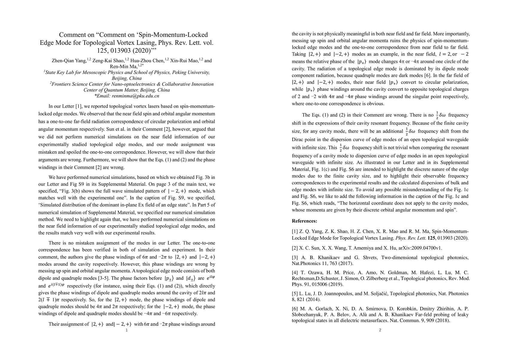 In our Letter (Phys. Rev. Lett. vol. 125, 013903 (2020)), we reported topological vortex lasers based on spin-momentum-locked edge modes. We observed that the near field spin and orbital angular momentum has a one-to-one far-field radiation correspondence of circular polarization and orbital angular momentum respectively. Sun et al. in their Comment (arXiv:2009.04700v1), however, argued that we did not perform numerical simulations on the near field information of our experimentally studied topological edge modes, and our mode assignment was mistaken and spoiled the one-to-one correspondence. However, we will show that their arguments are wrong. Furthermore, we will show that the Eqs. (1) and (2) and the phase windings in their Comment are wrong.