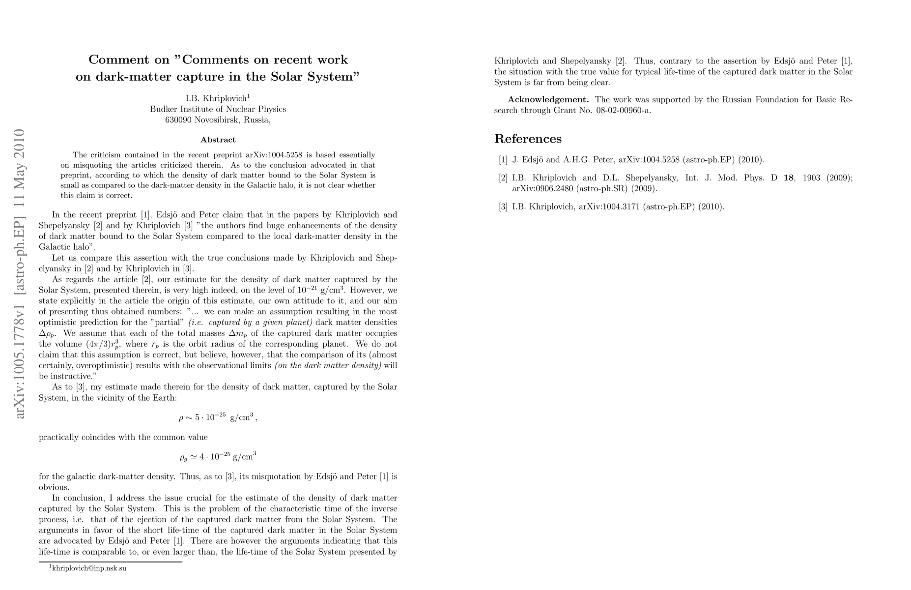 The criticism contained in the recent preprint arxiv:1004.5258 is based essentially on misquoting the articles criticized therein. As to the conclusion advocated in that preprint, according to which the density of dark matter bound to the Solar System is small as compared to the dark-matter density in the Galactic halo, it is not clear whether this claim is correct.