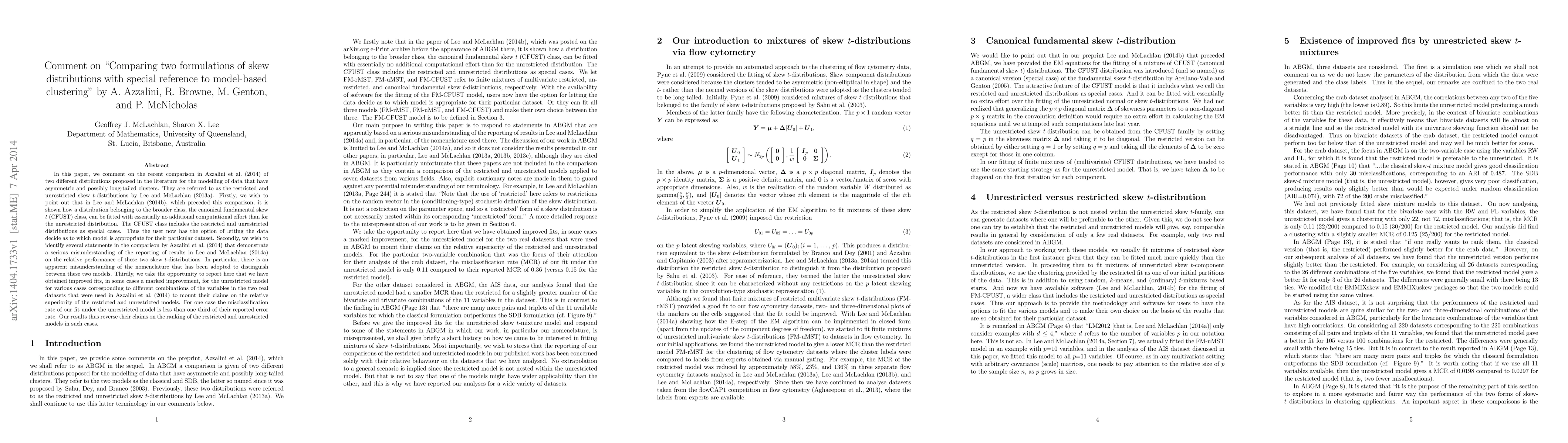 In this paper, we comment on the recent comparison in Azzalini et al. (2014) of two different distributions proposed in the literature for the modelling of data that have asymmetric and possibly long-tailed clusters. They are referred to as the restricted and unrestricted skew t-distributions by Lee and McLachlan (2013a). Firstly, we wish to point out that in Lee and McLachlan (2014b), which preceded this comparison, it is shown how a distribution belonging to the broader class, the canonical fundamental skew t (CFUST) class, can be fitted with essentially no additional computational effort than for the unrestricted distribution. The CFUST class includes the restricted and unrestricted distributions as special cases. Thus the user now has the option of letting the data decide as to which model is appropriate for their particular dataset. Secondly, we wish to identify several statements in the comparison by Azzalini et al.(2014) that demonstrate a serious misunderstanding of the reporting of results in Lee and McLachlan (2014a) on the relative performance of these two skew t-distributions. In particular, there is an apparent misunderstanding of the nomenclature that has been adopted to distinguish between these two models. Thirdly, we take the opportunity to report here that we have obtained improved fits, in some cases a marked improvement, for the unrestricted model for various cases corresponding to different combinations of the variables in the two real datasets that were used in Azzalini et al. (2014) to mount their claims on the relative superiority of the restricted and unrestricted models. For one case the misclassification rate of our fit under the unrestricted model is less than one third of their reported error rate. Our results thus reverse their claims on the ranking of the restricted and unrestricted models in such cases.