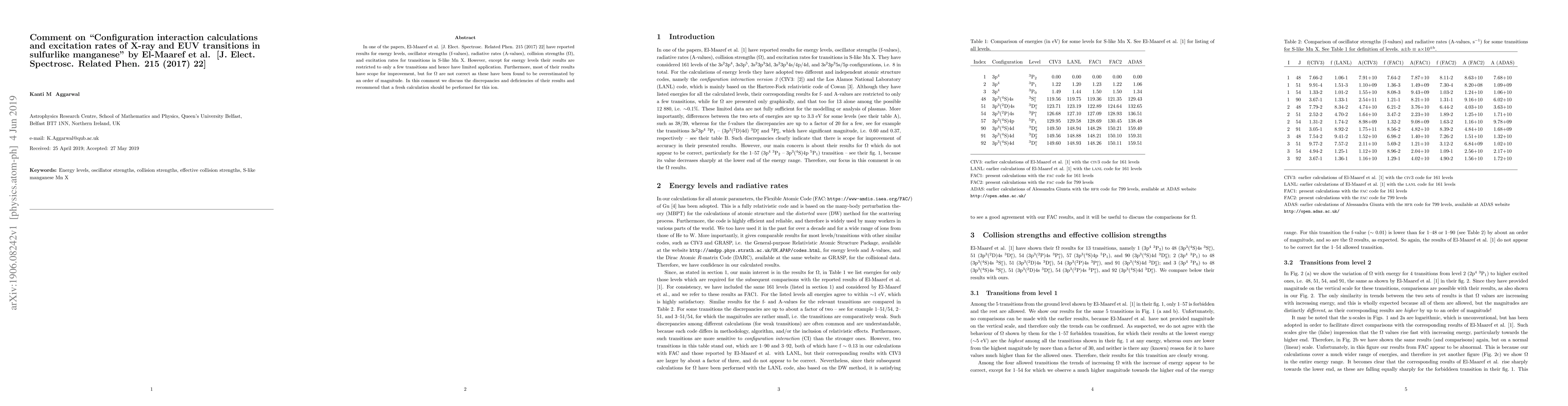 In one of the papers, El-Maaref et al. [J. Elect. Spectrosc. Related Phen. 215 (2017) 22] have reported results for energy levels, oscillator strengths (f-values), radiative rates (A-values), collision strengths ($\Omega$), and excitation rates for transitions in S-like Mn~X. However, except for energy levels their results are restricted to only a few transitions and hence have limited application. Furthermore, most of their results have scope for improvement, but for $\Omega$ are not correct as these have been found to be overestimated by an order of magnitude. In this comment we discuss the discrepancies and deficiencies of their results and recommend that a fresh calculation should be performed for this ion.