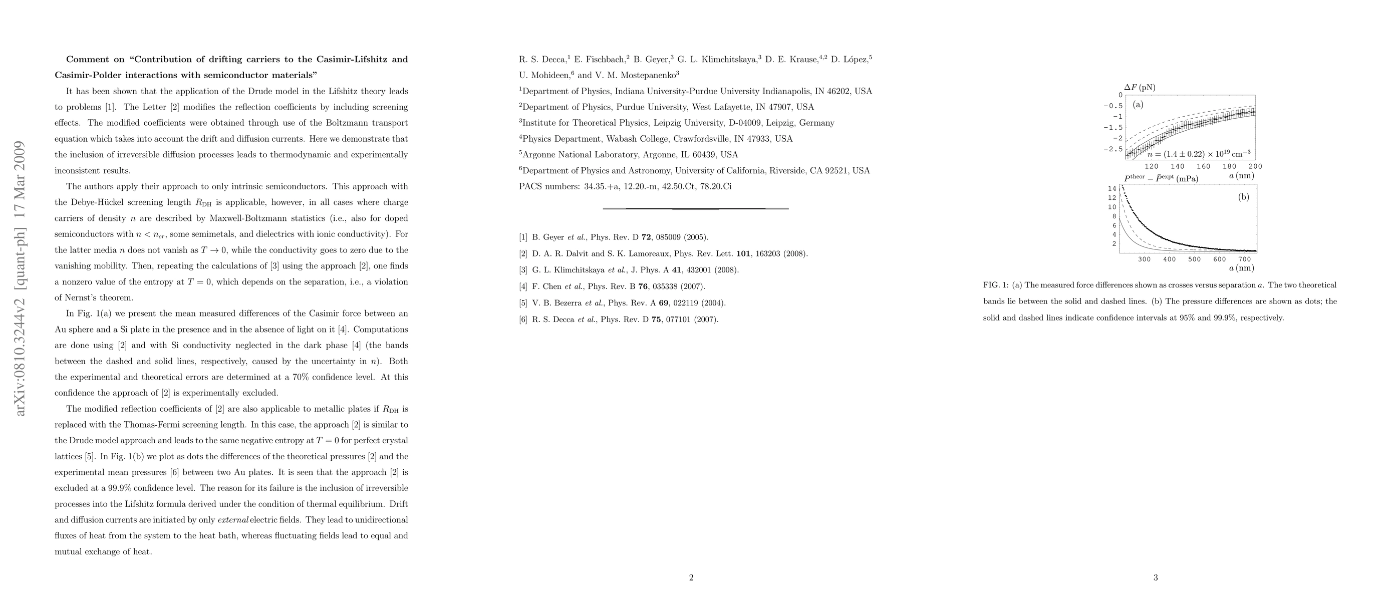 Recently D. A. R. Dalvit and S. K. Lamoreaux arXiv:0805.1676 [Phys. Rev. Lett. v.101, 163203 (2008)] suggested the modification of the reflection coefficients in the Lifshitz theory taking into account the screening effects and diffusion currents. We demonstrate that the suggested modification is thermodynamically and experimentally inconsistent.
