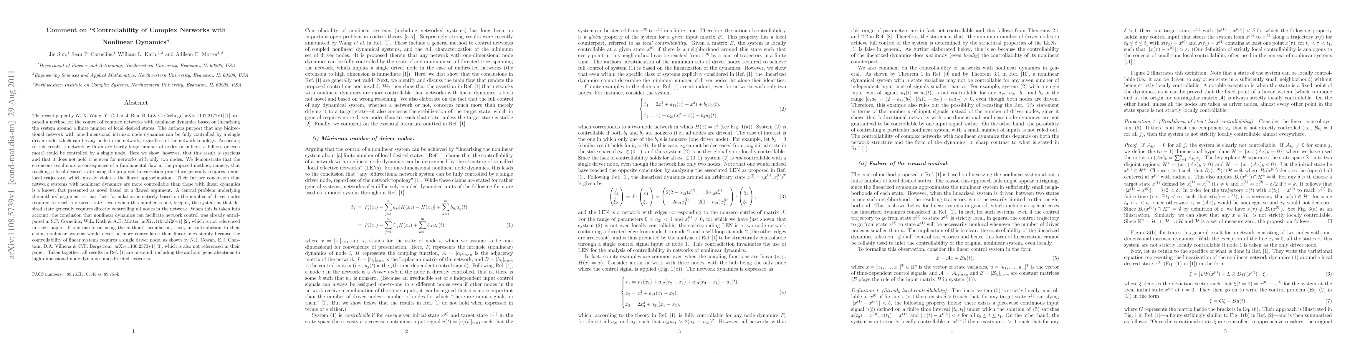 The recent paper by W.-X. Wang, Y.-C. Lai, J. Ren, B. Li & C. Grebogi [arXiv:1107.2177v1] proposed a method for the control of complex networks with nonlinear dynamics based on linearizing the system around a finite number of local desired states. The authors purport that any bidirectional network with one-dimensional intrinsic node dynamics can be fully controlled by a single driver node, which can be any node in the network, regardless of the network topology. According to this result, a network with an arbitrarily large number of nodes (a million, a billion, or even more) could be controlled by a single node. Here we show, however, that this result is specious and that it does not hold true even for networks with only two nodes. We demonstrate that the erroneous results are a consequence of a fundamental flaw in the proposed method, namely, that reaching a local desired state using the proposed linearization procedure generally requires a nonlocal trajectory, which grossly violates the linear approximation. Their further conclusion that network systems with nonlinear dynamics are more controllable than those with linear dynamics is a known fact presented as novel based on a flawed argument. A central problem underlying the authors' argument is that their formulation is entirely based on the number of driver nodes required to reach a desired state---even when this number is one, keeping the system at that desired state generally requires directly controlling all nodes in the network. When this is taken into account, the conclusion that nonlinear dynamics can facilitate network control was already anticipated in S.P. Cornelius, W.L. Kath & A.E. Motter [arXiv:1105.3726v1], which is not referenced in their paper. If one insists on using the authors' formulation, then, in contradiction to their claim, nonlinear systems would never be more controllable than linear ones because...