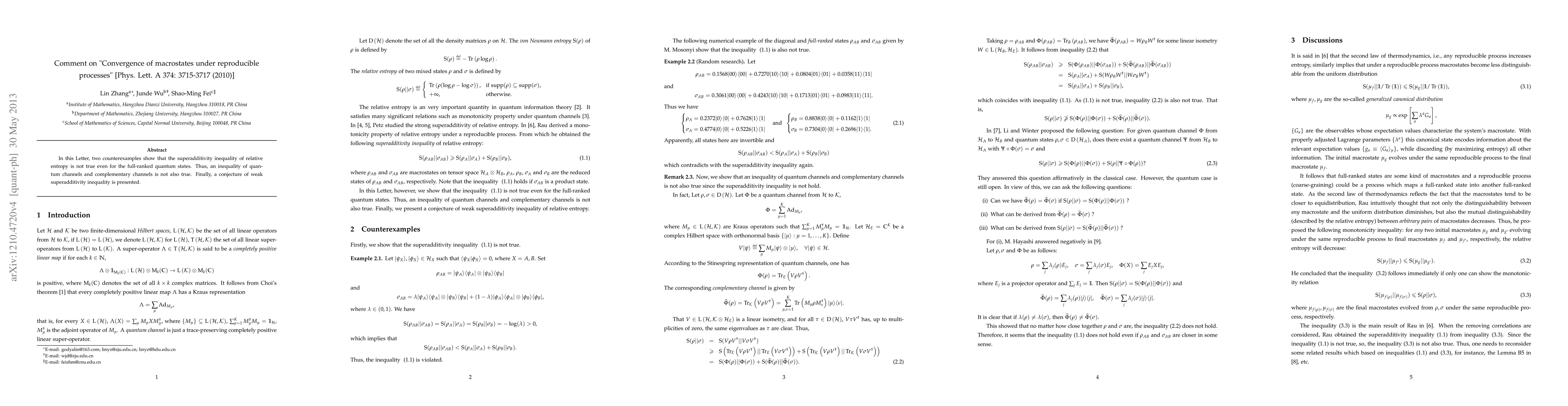 In this Letter, two counterexamples show that the superadditivity inequality of relative entropy is not true even for the full-ranked quantum states. Thus, an inequality of quantum channels and complementary channels is not also true. Finally, a conjecture of weak superadditivity inequality is presented.