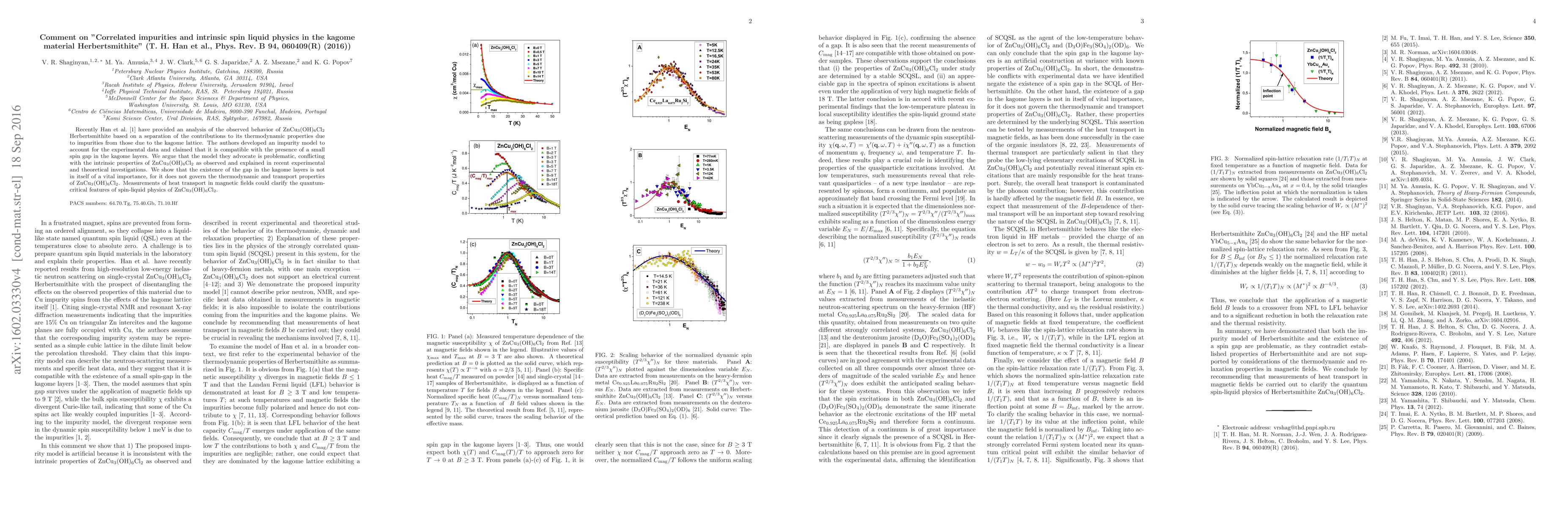 This paper critiques Han et al.'s analysis of Herbertsmithite's thermodynamic properties, arguing that their impurity model is flawed and does not align with recent experimental and theoretical findings. The authors suggest that the presence of a spin gap in the kagome layers is not crucial for the material's properties, and propose magnetic field-induced heat transport measurements to better understand its quantum-critical spin-liquid behavior.