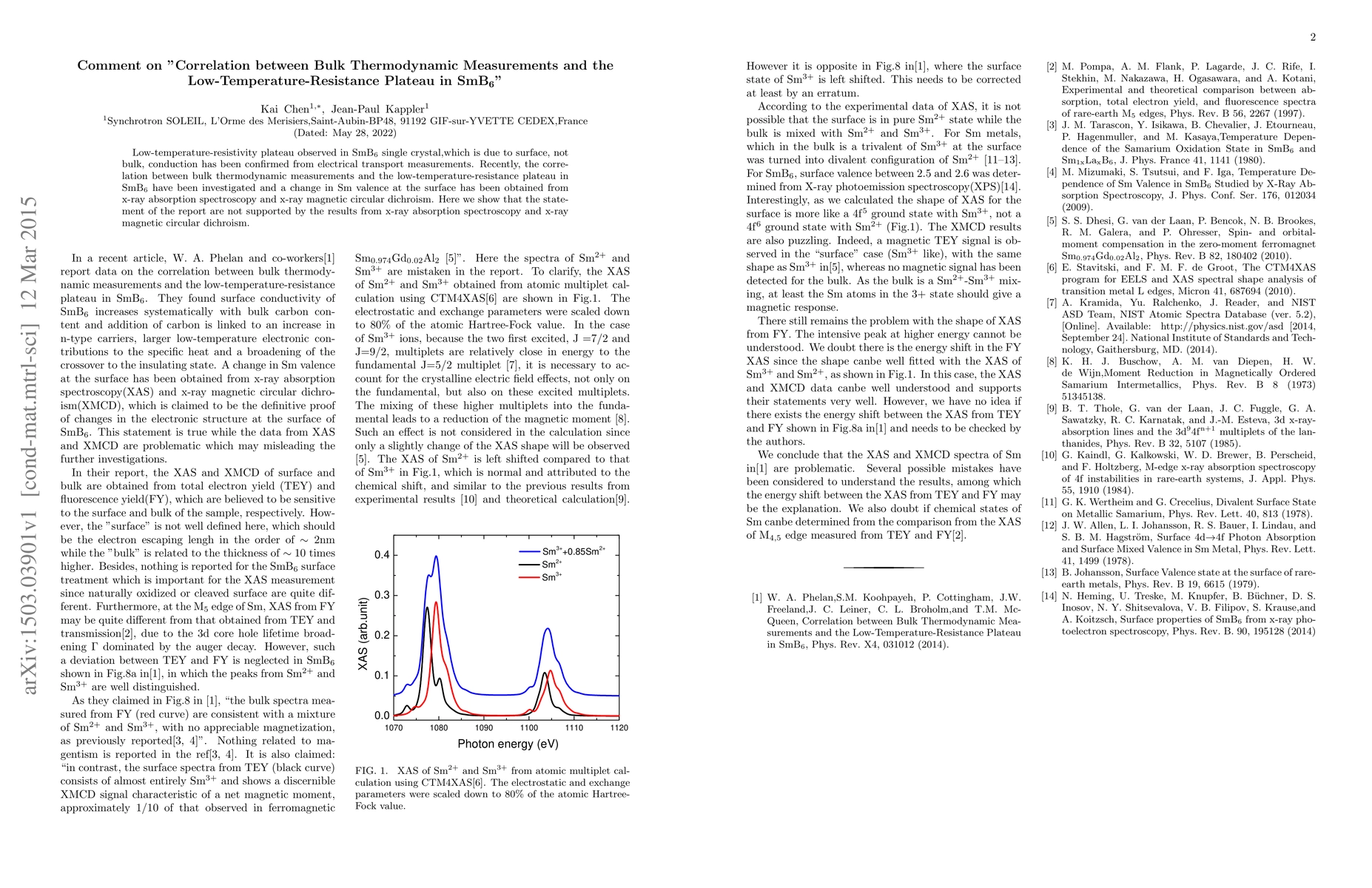 Low-temperature-resistivity plateau observed in $\rm SmB_6$ single crystal,which is due to surface, not bulk, conduction has been confirmed from electrical transport measurements. Recently, the correlation between bulk thermodynamic measurements and the low-temperature-resistance plateau in $\rm SmB_6$ have been investigated and a change in Sm valence at the surface has been obtained from x-ray absorption spectroscopy and x-ray magnetic circular dichroism. Here we show that the statement of the report are not supported by the results from x-ray absorption spectroscopy and x-ray magnetic circular dichroism.