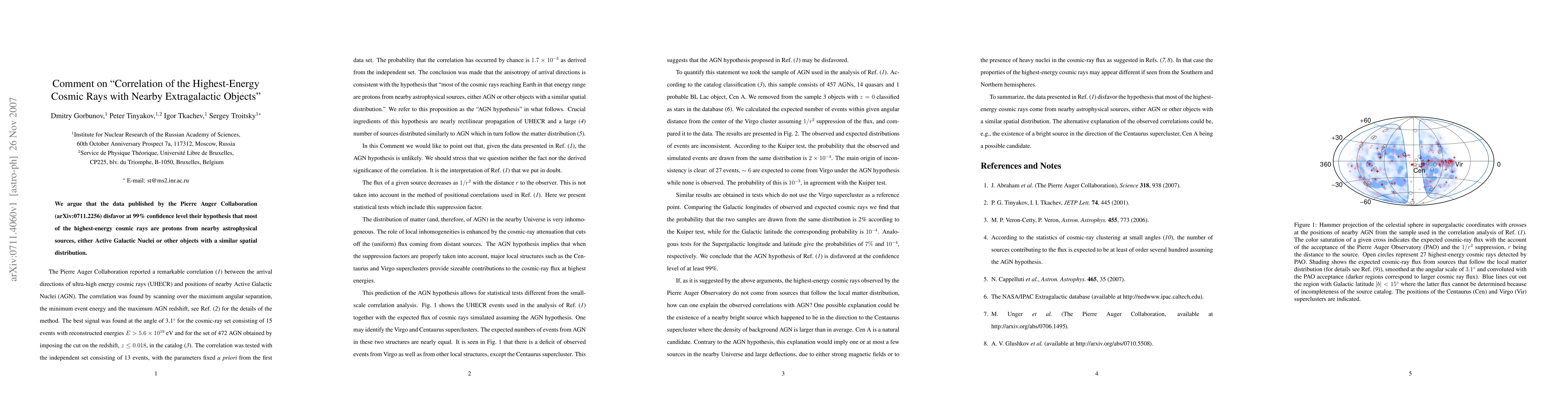 We argue that the data published by the Pierre Auger Collaboration (arXiv:0711.2256) disfavor at 99% confidence level their hypothesis that most of the highest-energy cosmic rays are protons from nearby astrophysical sources, either Active Galactic Nuclei or other objects with a similar spatial distribution.