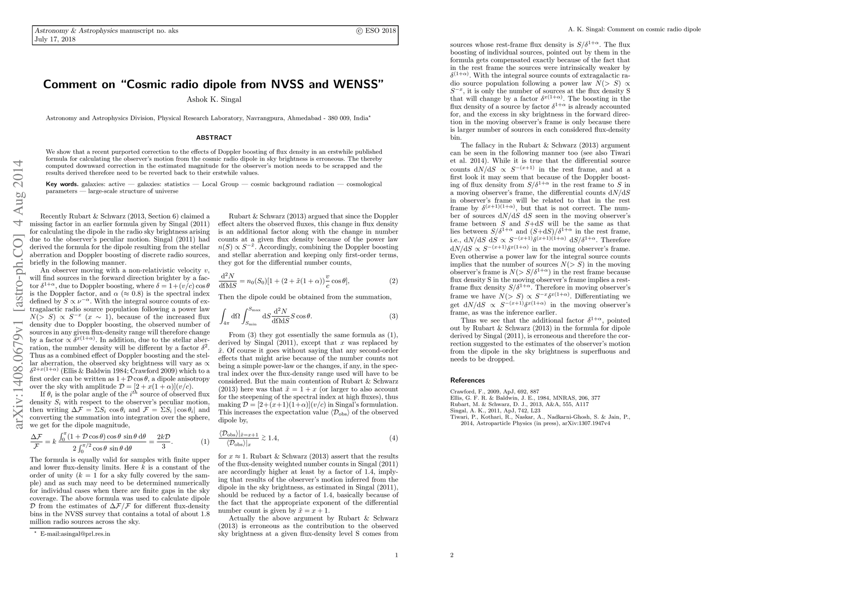 We show that a recent purported correction to the effects of Doppler boosting of flux density in an erstwhile published formula for calculating the observer's motion from the cosmic radio dipole in sky brightness is erroneous. The thereby computed downward correction in the estimated magnitude for the observer's motion needs to be scrapped and the results derived therefore need to be reverted back to their erstwhile values.