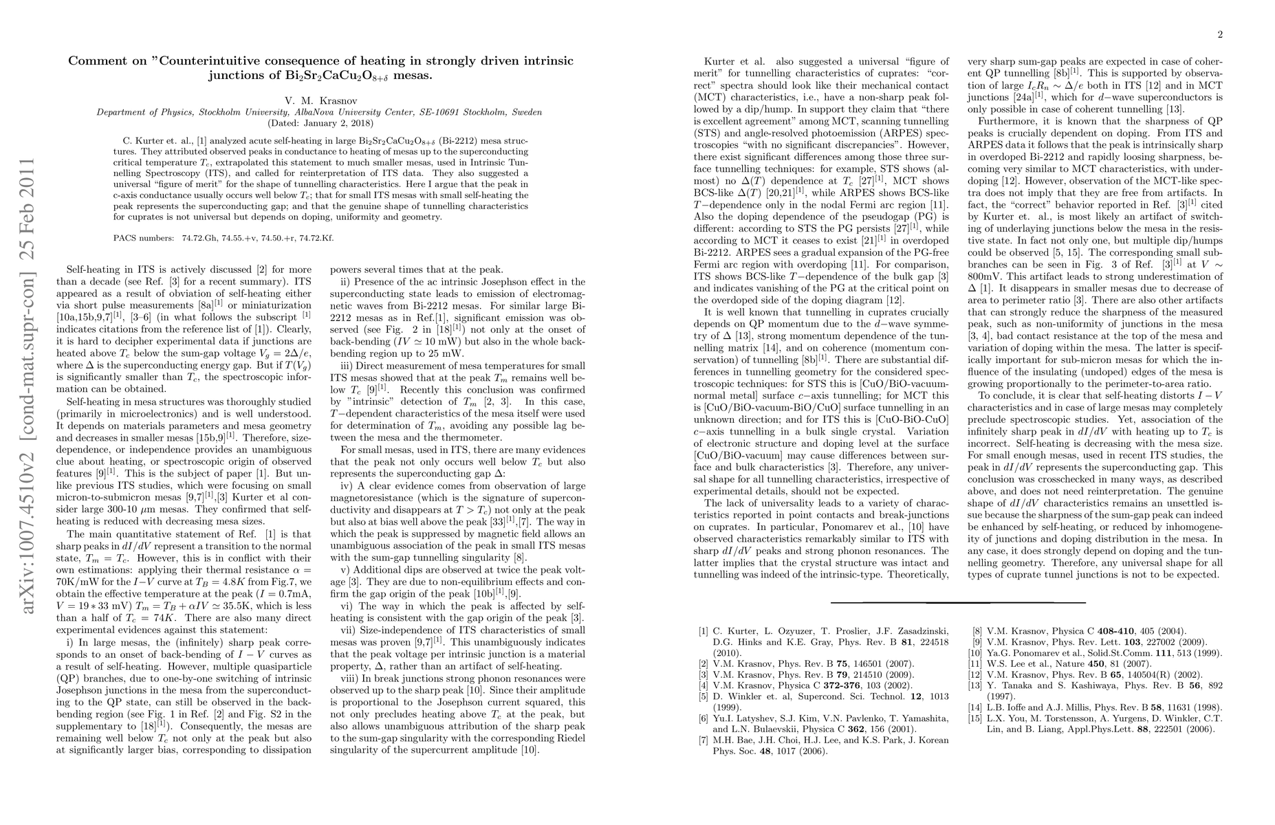 In a recent paper [Phys.Rev.B 81, 224518 (2010)], C. Kurter et al, analyzed the effect of strong self-heating in large-area Bi$_2$Sr$_2$CaCu$_2$O$_{8+\delta}$ (Bi-2212) mesa structures. They conclude that $dI/dV$ conductance peaks in their mesas occur when mesas are heated to the superconducting critical temperature $T_c$. Further on they extrapolate this statement for all mesas, including much smaller and much better thermally anchored mesas used in Intrinsic Tunnelling Spectroscopy (ITS). Here I show that their conclusion does not hold neither for previously reported data, nor even for their own mesas; the very remote extrapolation to ITS is invalid. I also point out a number of inconsistencies and misleading references.