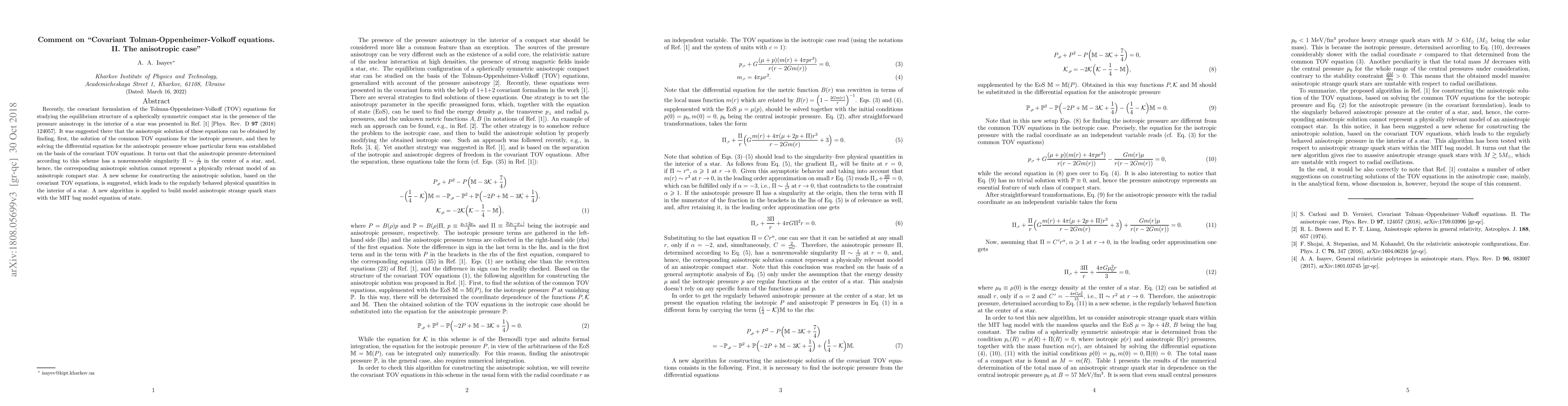 Recently, the covariant formulation of the Tolman-Oppenheimer-Volkoff (TOV) equations for studying the equilibrium structure of a spherically symmetric compact star in the presence of the pressure anisotropy in the interior of a star was presented in Phys. Rev. D \textbf{97} (2018) 124057. It was suggested there that the anisotropic solution of these equations can be obtained by finding, first, the solution of the common TOV equations for the isotropic pressure, and then by solving the differential equation for the anisotropic pressure whose particular form was established on the basis of the covariant TOV equations. It turns out that the anisotropic pressure determined according to this scheme has a nonremovable singularity $\Pi\sim\frac{1}{r^2}$ in the center of a star, and, hence, the corresponding anisotropic solution cannot represent a physically relevant model of an anisotropic compact star. A new scheme for constructing the anisotropic solution, based on the covariant TOV equations, is suggested, which leads to the regularly behaved physical quantities in the interior of a star. A new algorithm is applied to build model anisotropic strange quark stars with the MIT bag model equation of state.