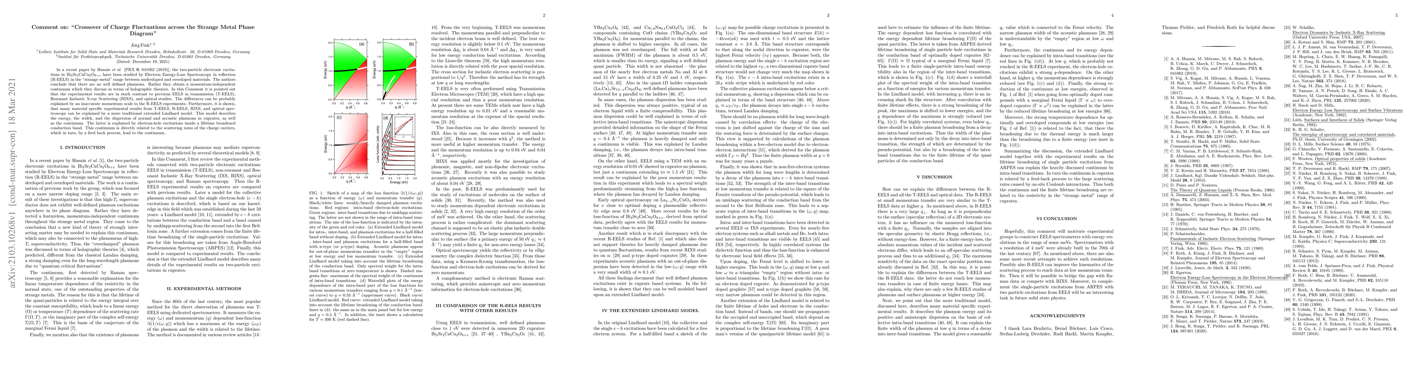 In a recent paper by Husain et al. [PRX 9, 041062 (2019)], the two-particle electronic excitations in Bi2Sr2CaCu2O8+x have been studied by Electron Energy-Loss Spectroscopy in reflection (R-EELS) in the strange metal range between underdoped and overdoped materials. The authors conclude that there are no well defined plasmons. Rather they obtain a momentum-independent continuum which they discuss in terms of holographic theories. In this Comment it is pointed out that the experimental results are in stark contrast to previous EELS in transmission (T-EELS), Resonant Inelastic X-ray Scattering (RIXS), and optical studies. The differences can be probably explained by an inaccurate momentum scale in the R-EELS experiments. Furthermore, it is shown, that many material specific experimental results from T-EELS, R-EELS, RIXS, and optical spectroscopy can be explained by a more traditional extended Lindhard model. This model describes the energy, the width, and the dispersion of normal and acoustic plasmons in cuprates, as well as the continuum. The latter is explained by electron-hole excitations inside a lifetime broadened conduction band. This continuum is directly related to the scattering rates of the charge carriers, which in turn, by a feed back process, lead to the continuum.