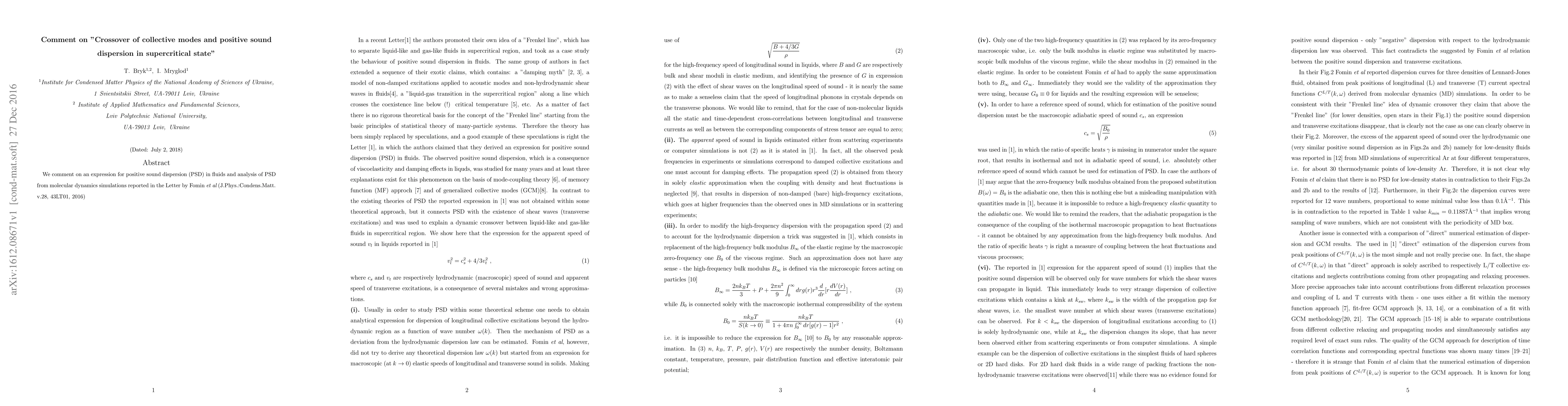 We comment on an expression for positive sound dispersion (PSD) in fluids and analysis of PSD from molecular dynamics simulations reported in the Letter by Fomin et al (J.Phys.:Condens.Matt. v.28, 43LT01, 2016)