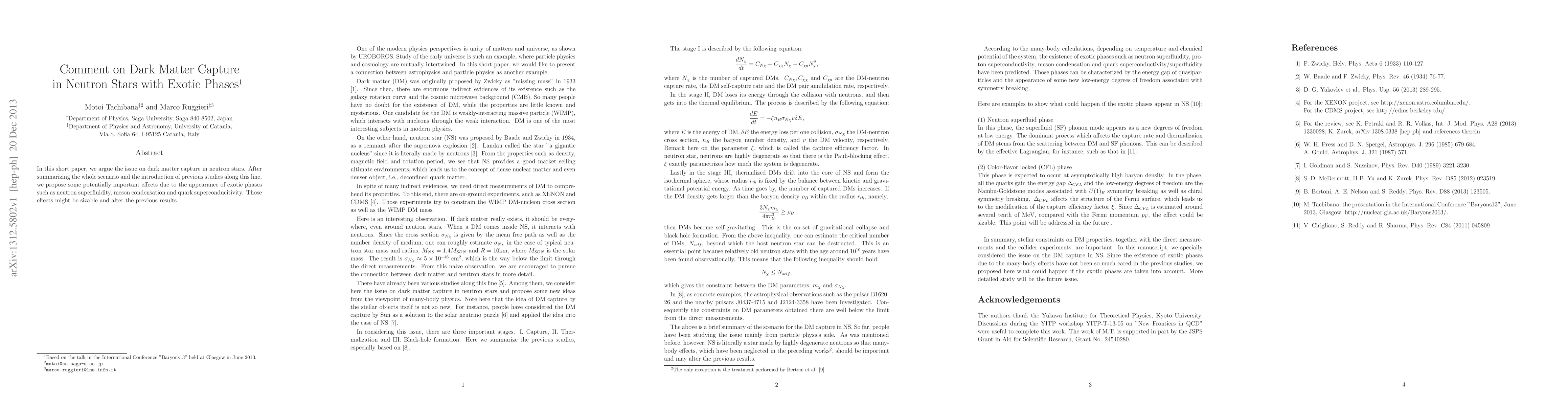 In this short paper, we argue the issue on dark matter capture in neutron stars. After summarizing the whole scenario and the introduction of previous studies along this line, we propose some potentially important effects due to the appearance of exotic phases such as neutron superfluidity, meson condensation and quark superconductivity. Those effects might be sizable and alter the previous results.