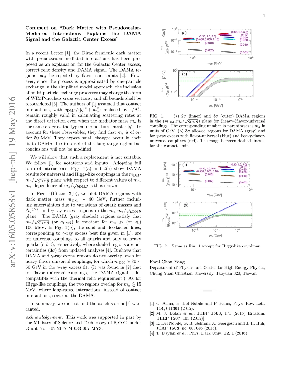 This paper critiques the model proposed by Arina et al. for explaining the Galactic Center excess and DAMA signal using Dirac fermionic dark matter with pseudoscalar mediation. It argues that the assumption of contact interactions is invalid, showing that the correct interaction form excludes the gamma-ray excess parameters from the DAMA iodine 3$\sigma$ region, except for specific Higgs-like couplings where long-range interactions dominate.